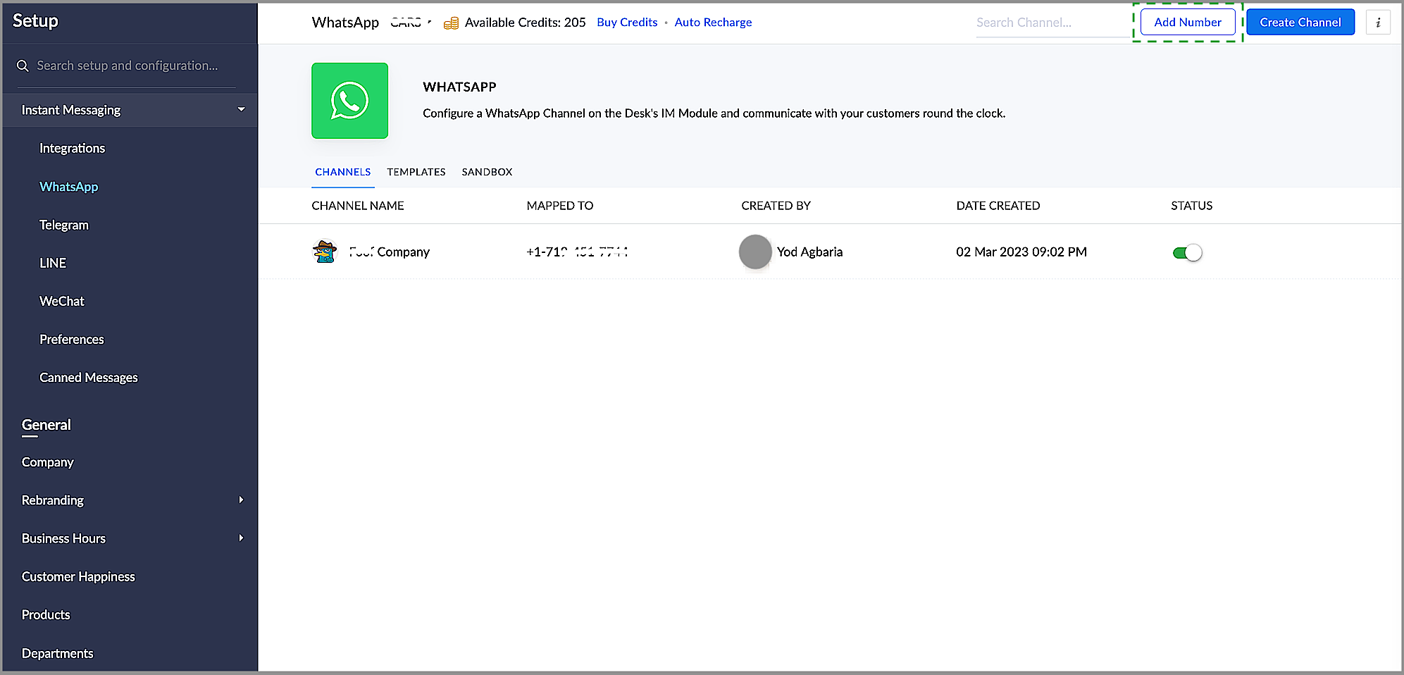 Before you change the number for a configured channel, make sure to add the desired number(s). To do this, select the Add Number option in the module (Embedded SignUp) by navigating to Setup -> Instant Messaging -> WhatsApp. Then, on the top bar, select Add Number. You can also directly add it to your Facebook Business Manager AccountKeep in mind, before you select the number to be reconfigured to your channel, the Business Name Status must show as Approved, the phone number Connection Status can be Pending or Disconnected, and the phone number Verification Status must be Verified as highlighted in the following screenshot.