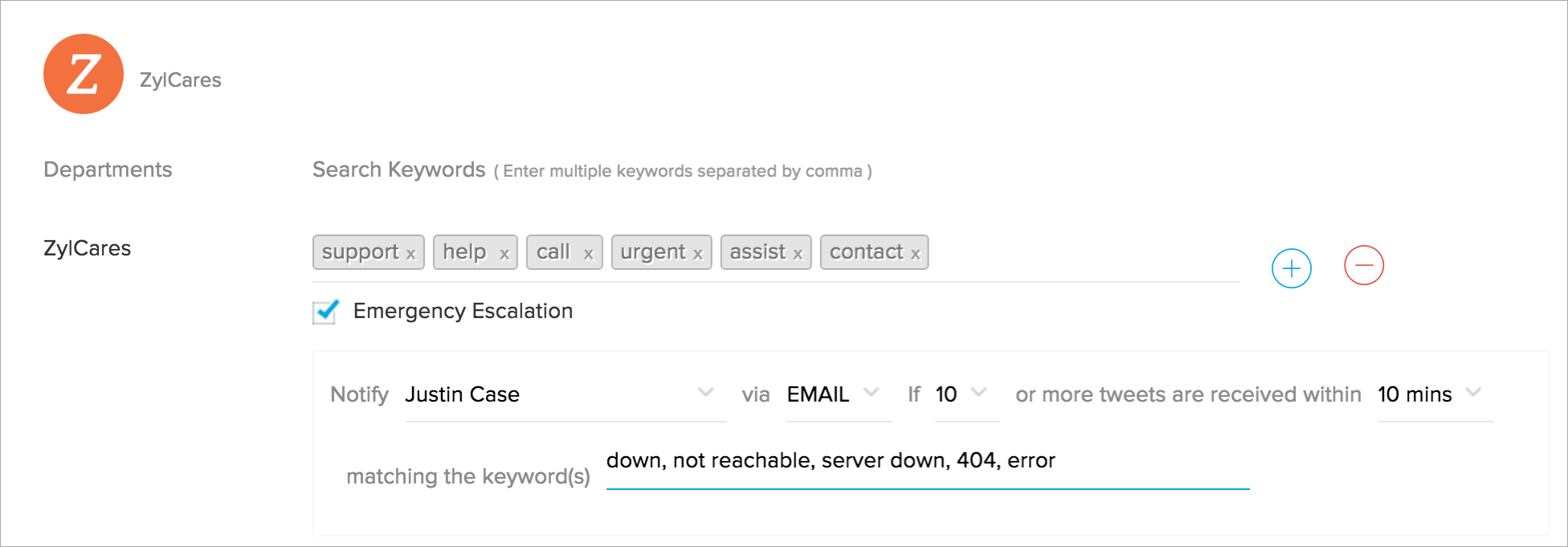 Failing to respond to customer's pain in times of crisis can irreversibly tarnish your brand reputation. Emergency Escalation in Zoho Desk will keep you informed about the activities that turn viral in your Twitter account. Zoho Desk will continually monitor your account for a flurry of tweets that matches the specified keywords within a particular period.