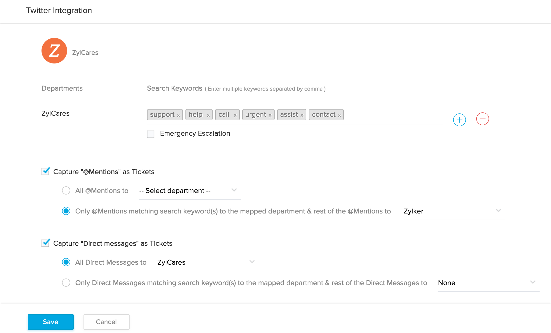 If you have more than one active department, you can capture the tweets as tickets in the appropriate department. You can also choose to capture tweets as tickets in a particular department when they do not match the specified keywords.