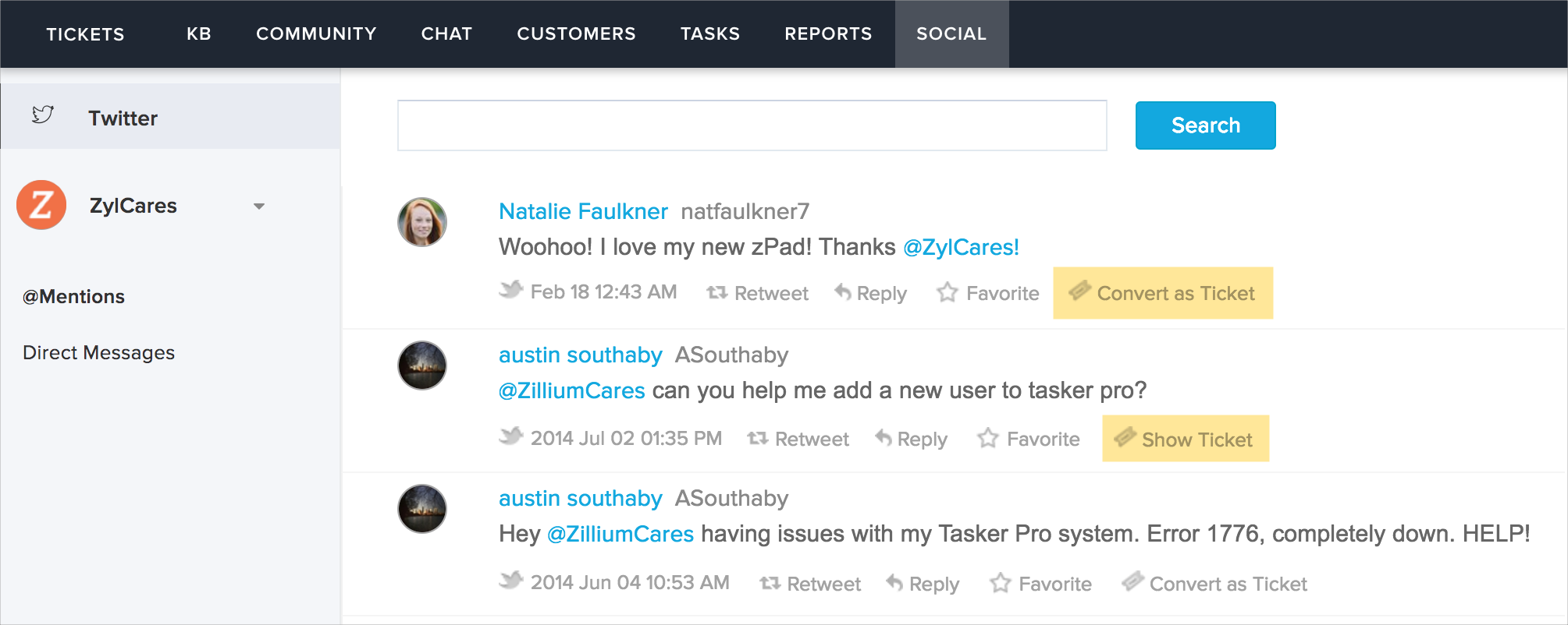 You can view all the tweets and messages of your Twitter account under the Social tab in Zoho Desk. Here is how you could view the messages and mentions in your help desk: