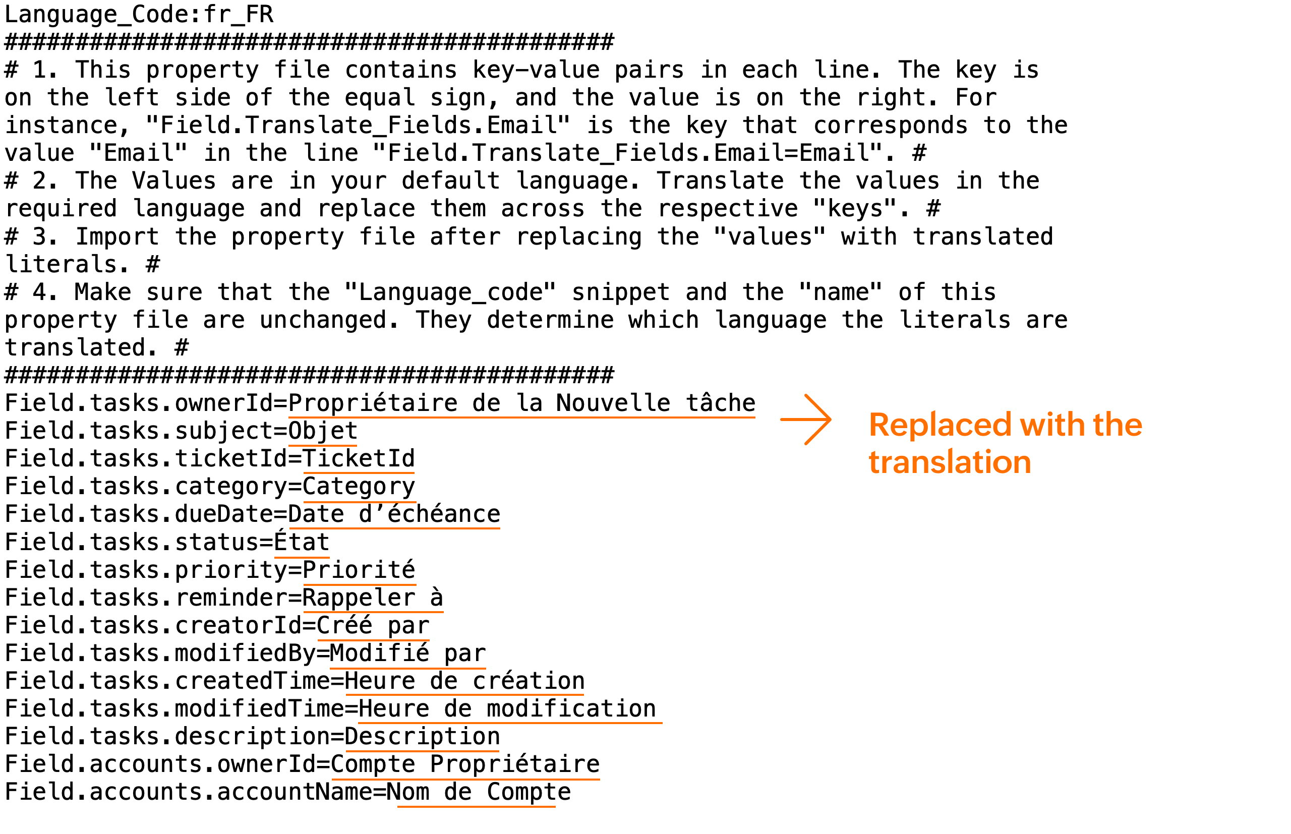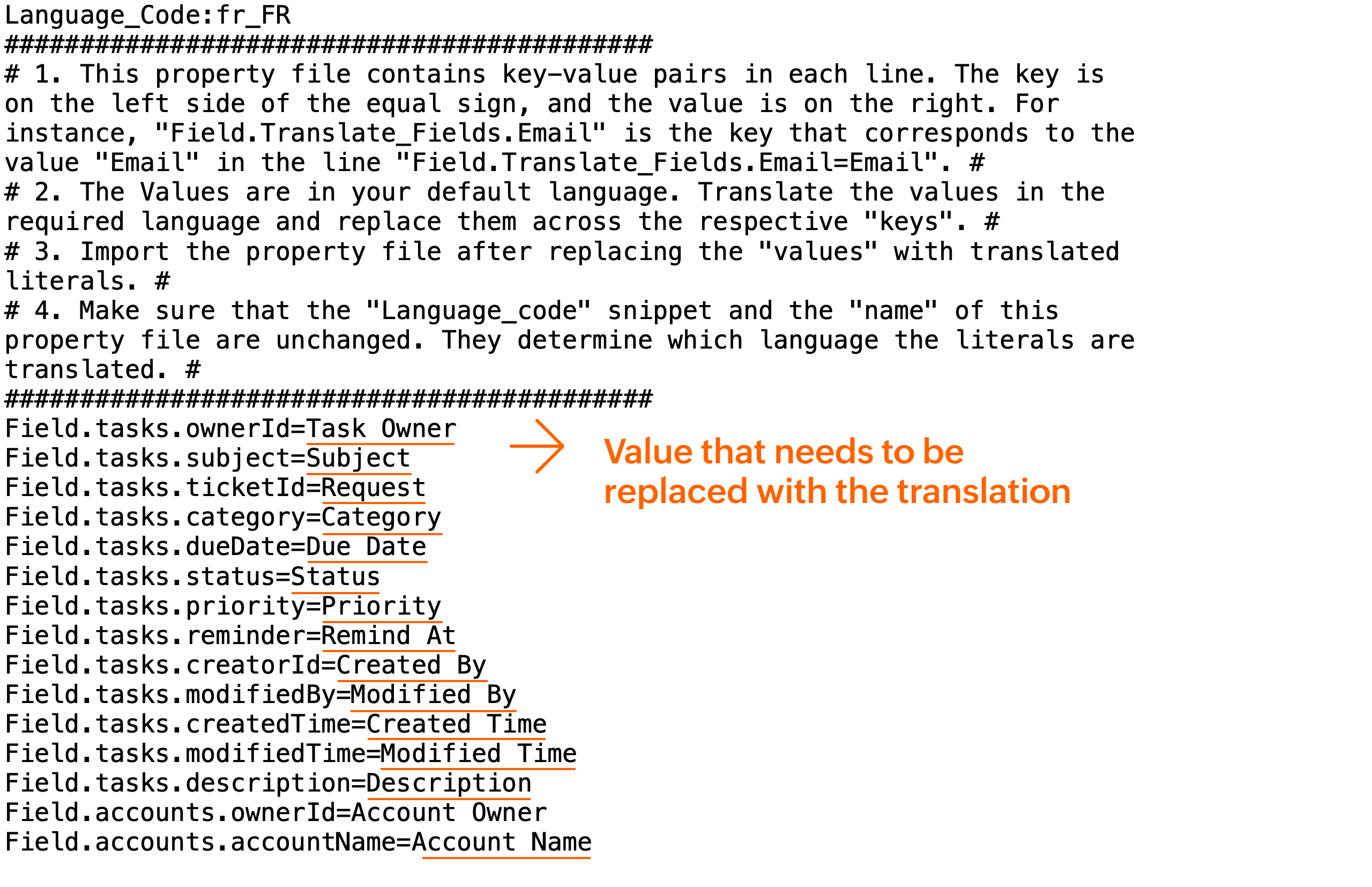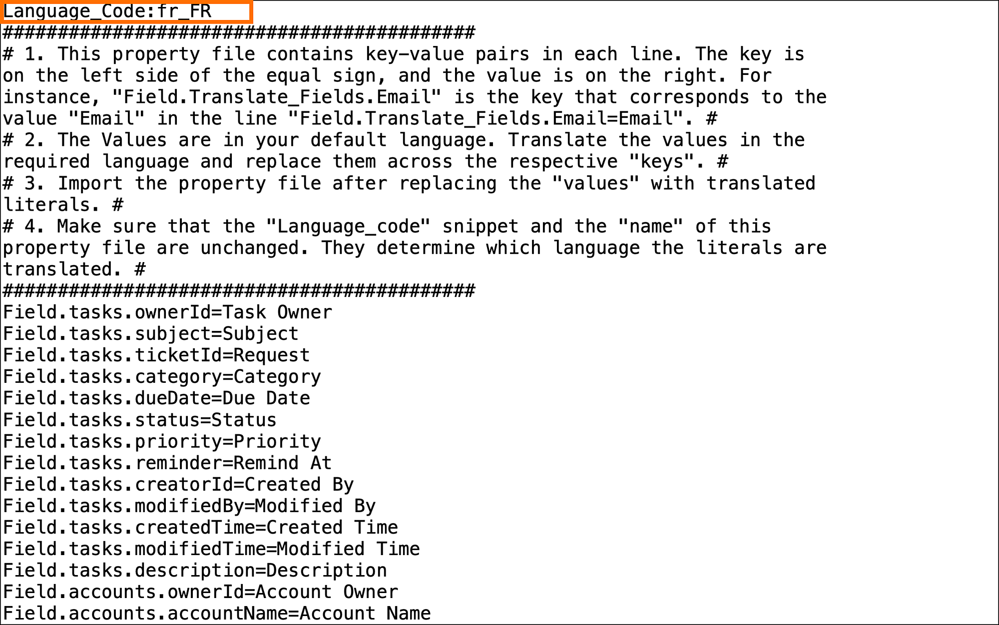 10. In the same file, replace the values after the '=', such asTask Owner, Subject, or Priority, with the appropriate translated value. (highlighted in the image below.)