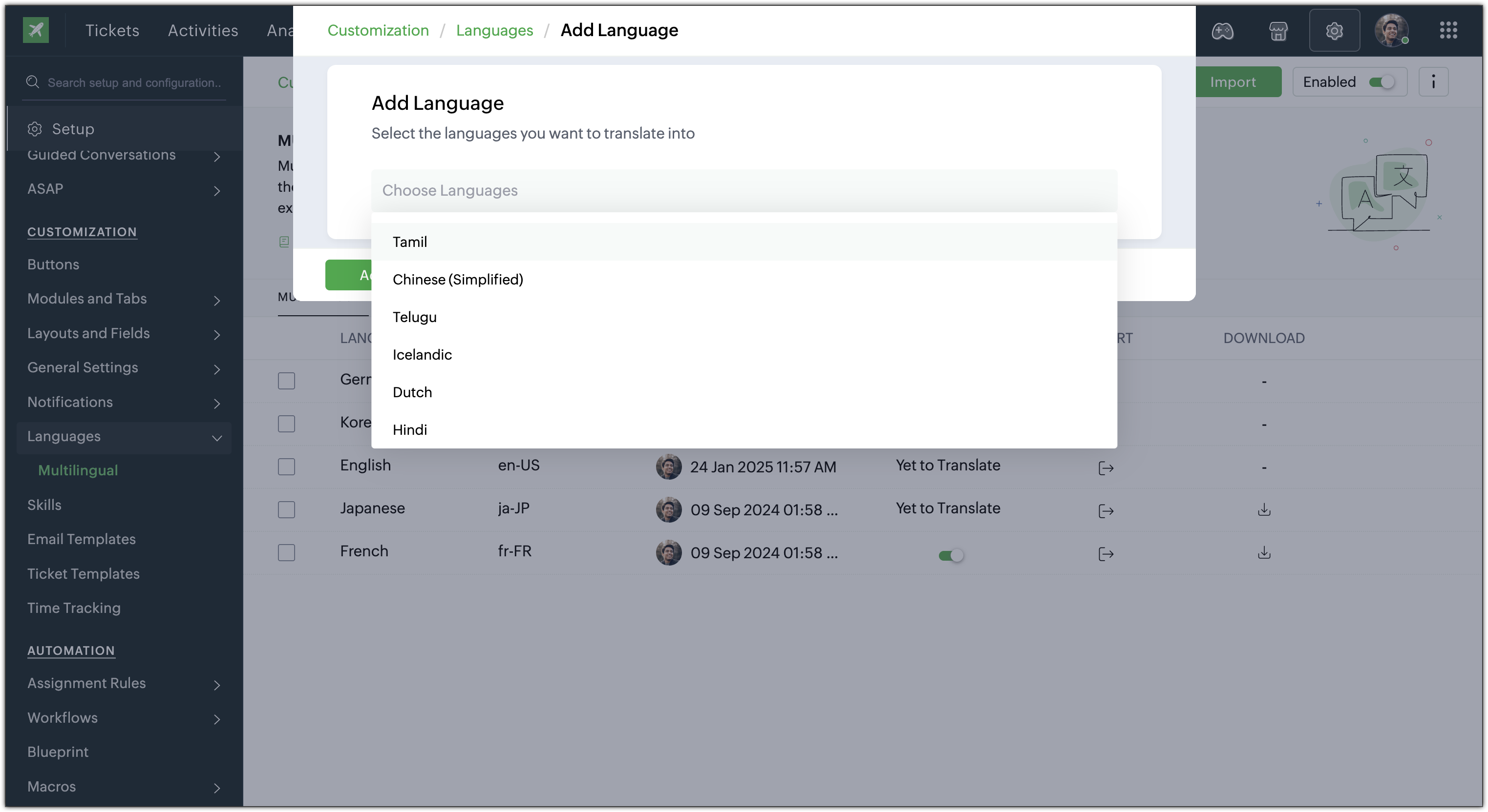 Consider a technology company headquartered in the US that has expanded its business to other locations and has regional offices across the EU, Australia, and Japan. A support agent from France finds it difficult to fill in the details in the ticket creation form since the fields and the values in the form are in the English language. Often due to misinterpretation, the agent inadvertently adds incorrect information in the ticket, which causes delay in providing resolution, affecting the overall customer experience.