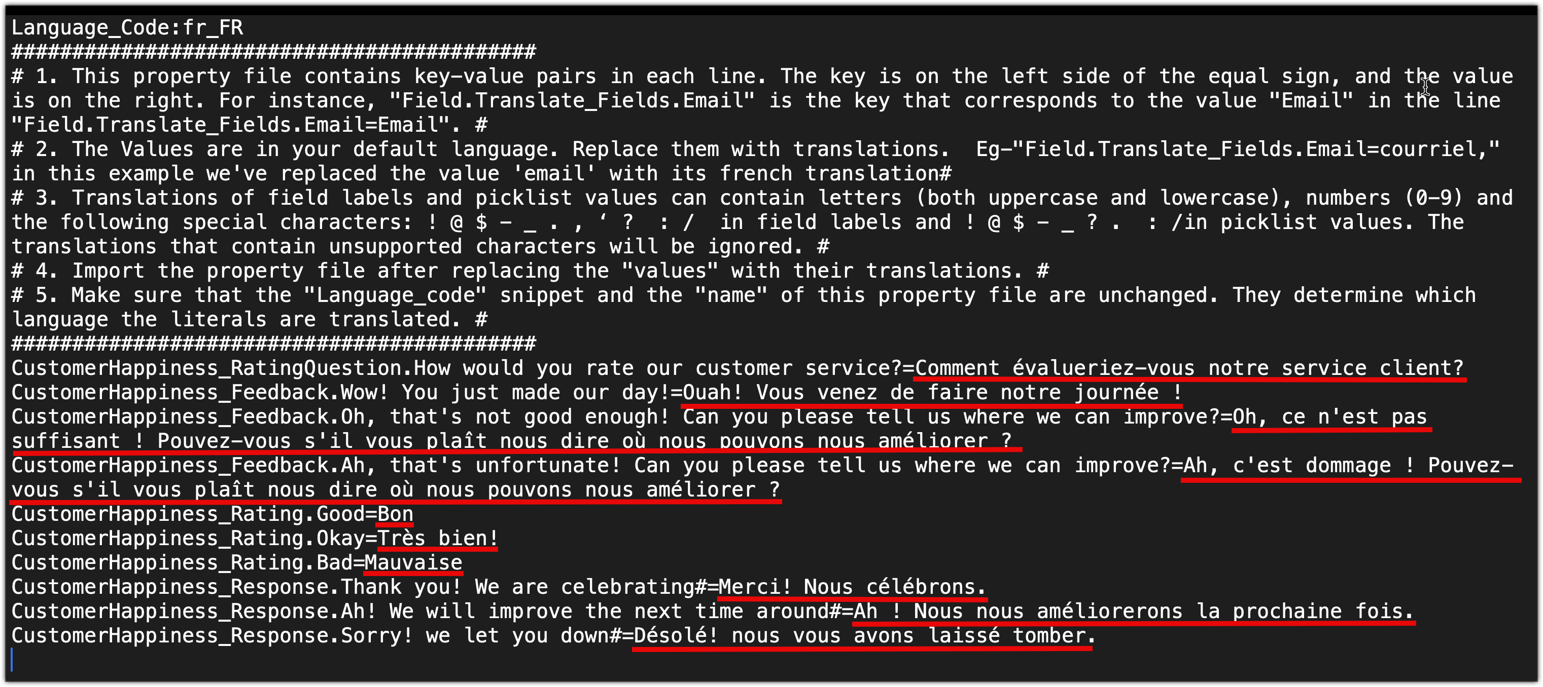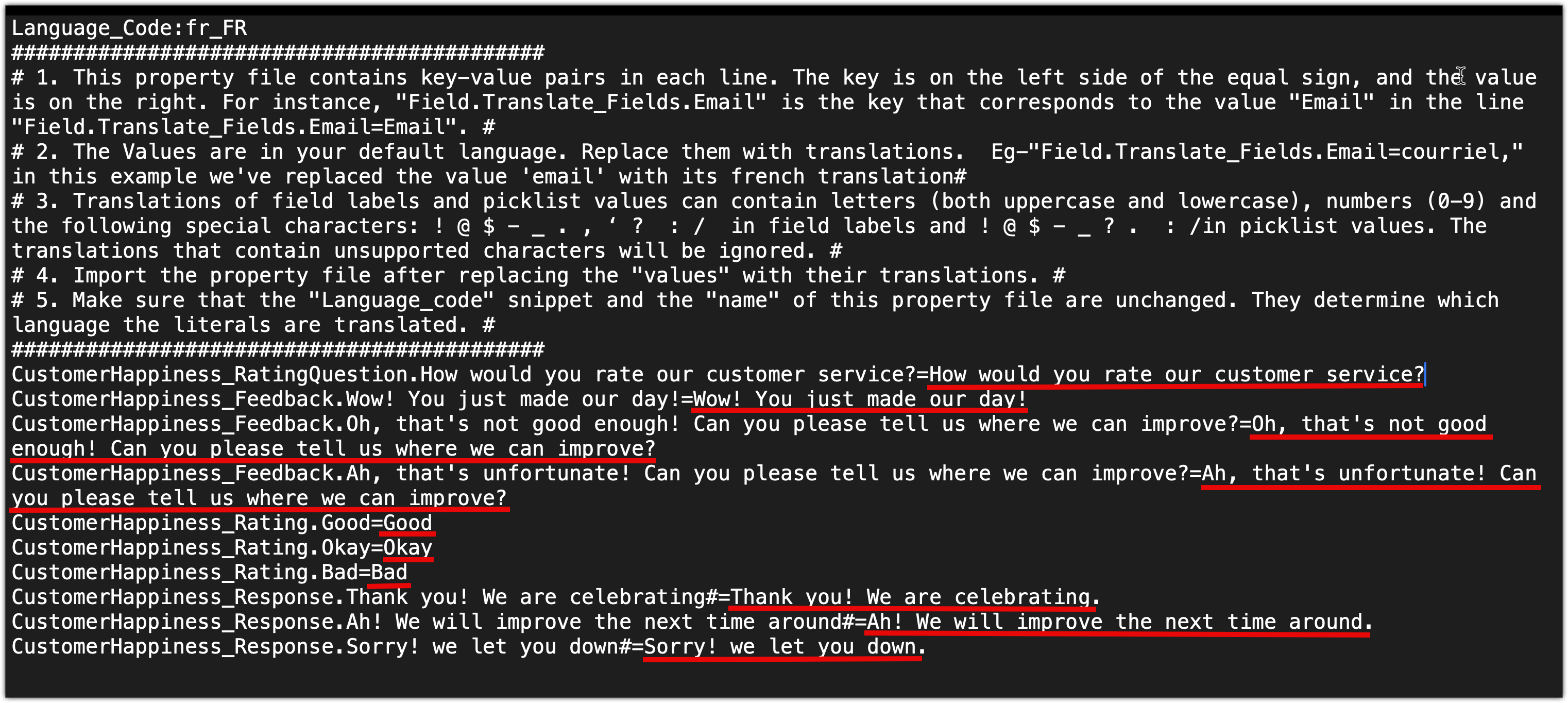 In the same file, replace the values after the '=' with the appropriate translated text. For example, replace "How would you rate our customer service?" with its French translation, "Comment évalueriez-vous note service client?" The image below highlights the text.