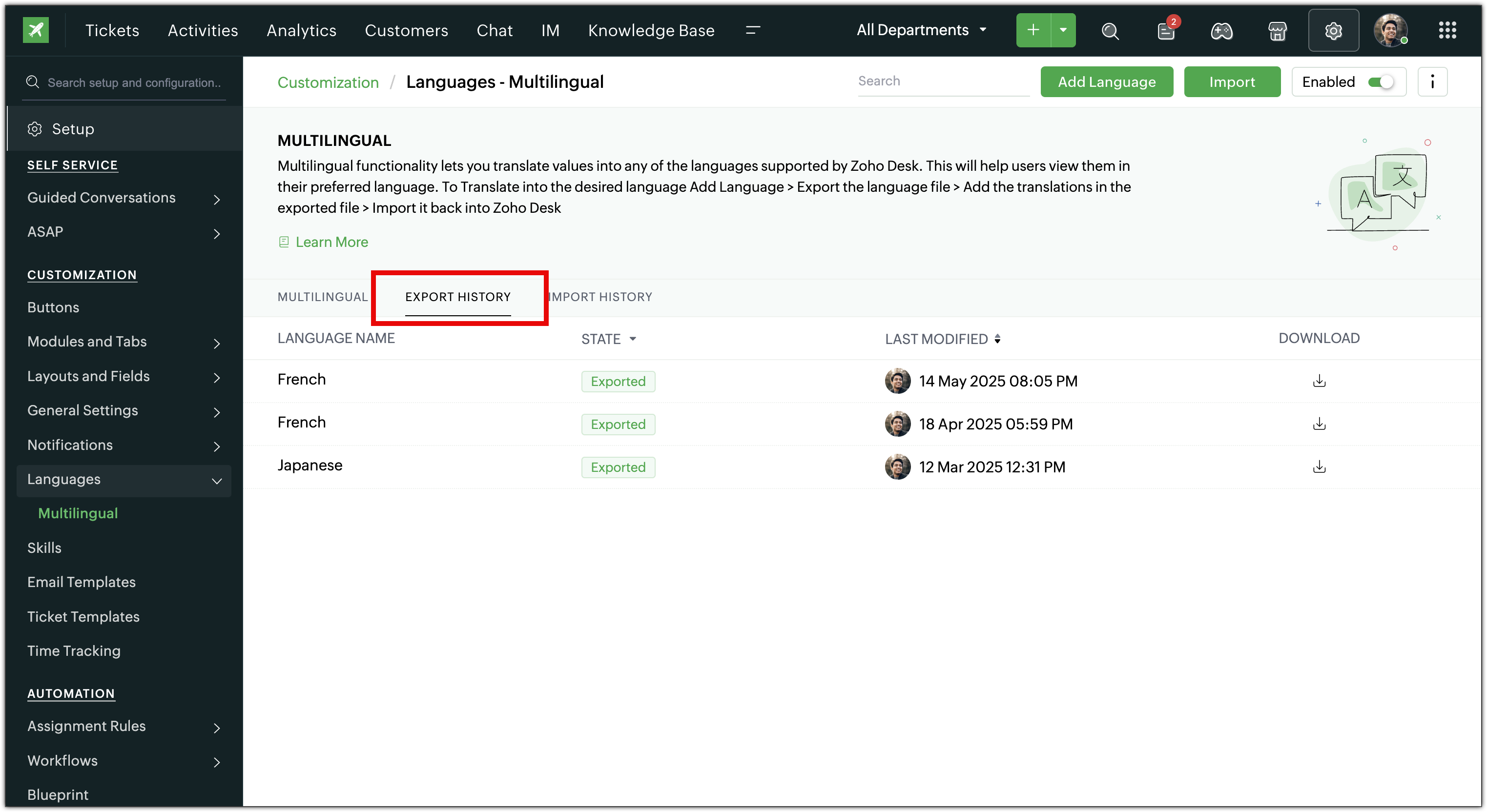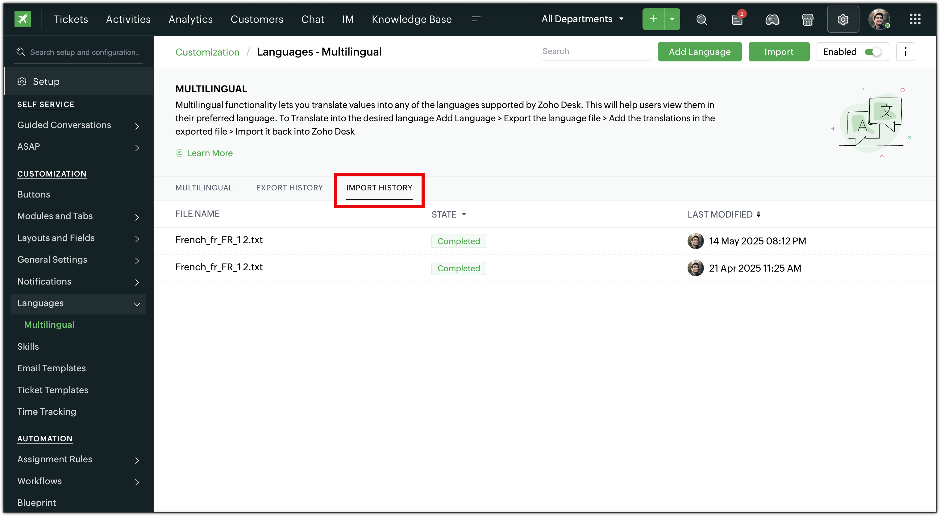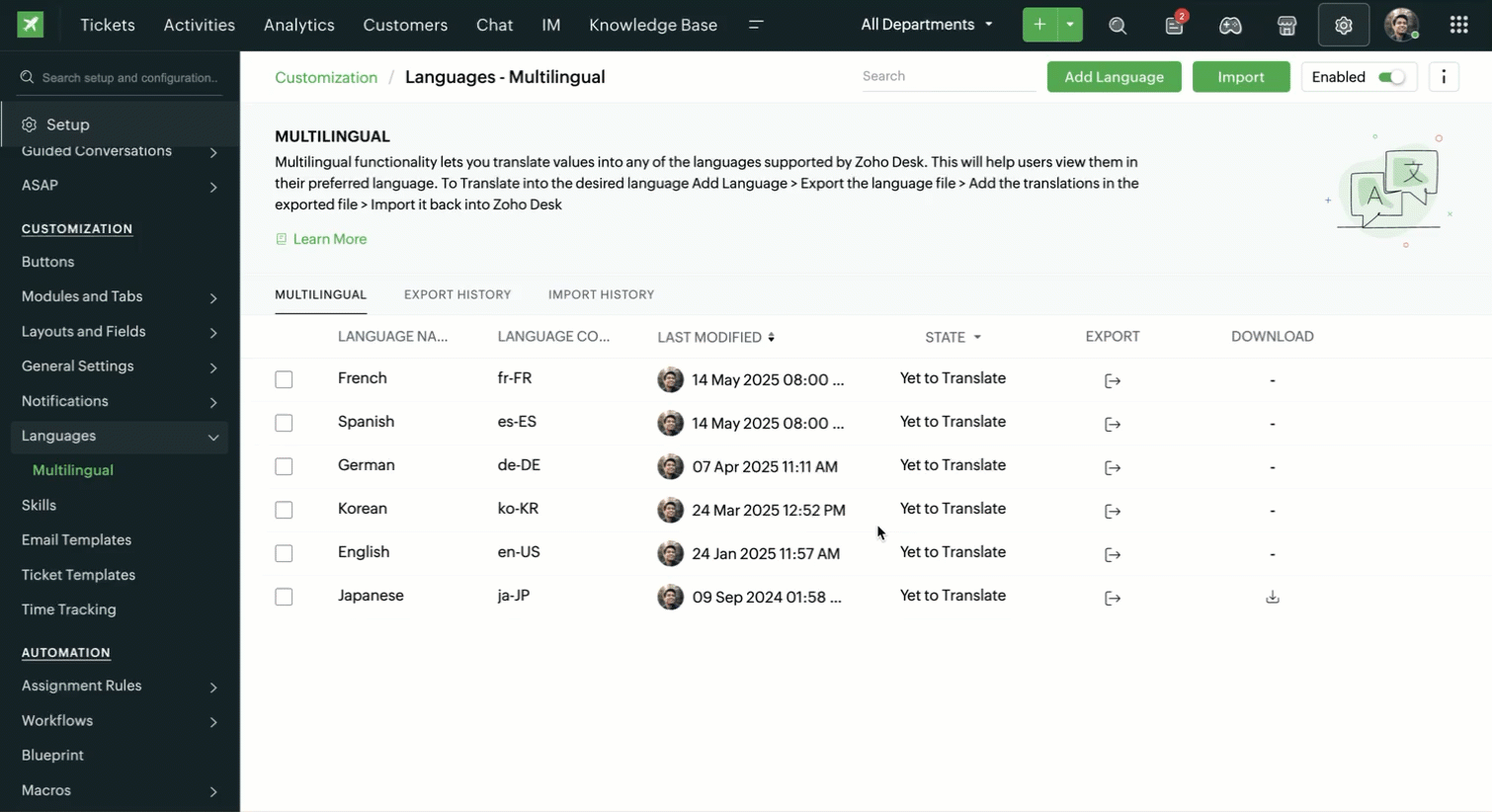 If you have imported the wrong file or do not want your users to use a particular translation file, you can disable it in your Zoho Desk account.