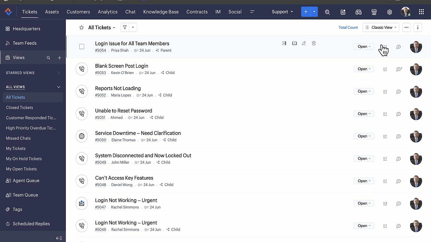 1. All ticket-related actions are dynamically reflected without requiring a page refresh. For example, when an agent closes an Open ticket, it automatically moves to the Closed column, under Status mode.