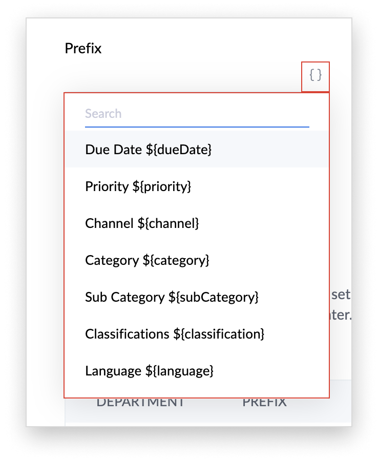To use dynamic values in your prefix and suffix fields, you must enter the placeholder of the field you want to include in the ticket ID. All default and custom ticket fields, except lookup, multi-select lookup, text area, and encrypted fields, are available as placeholders.