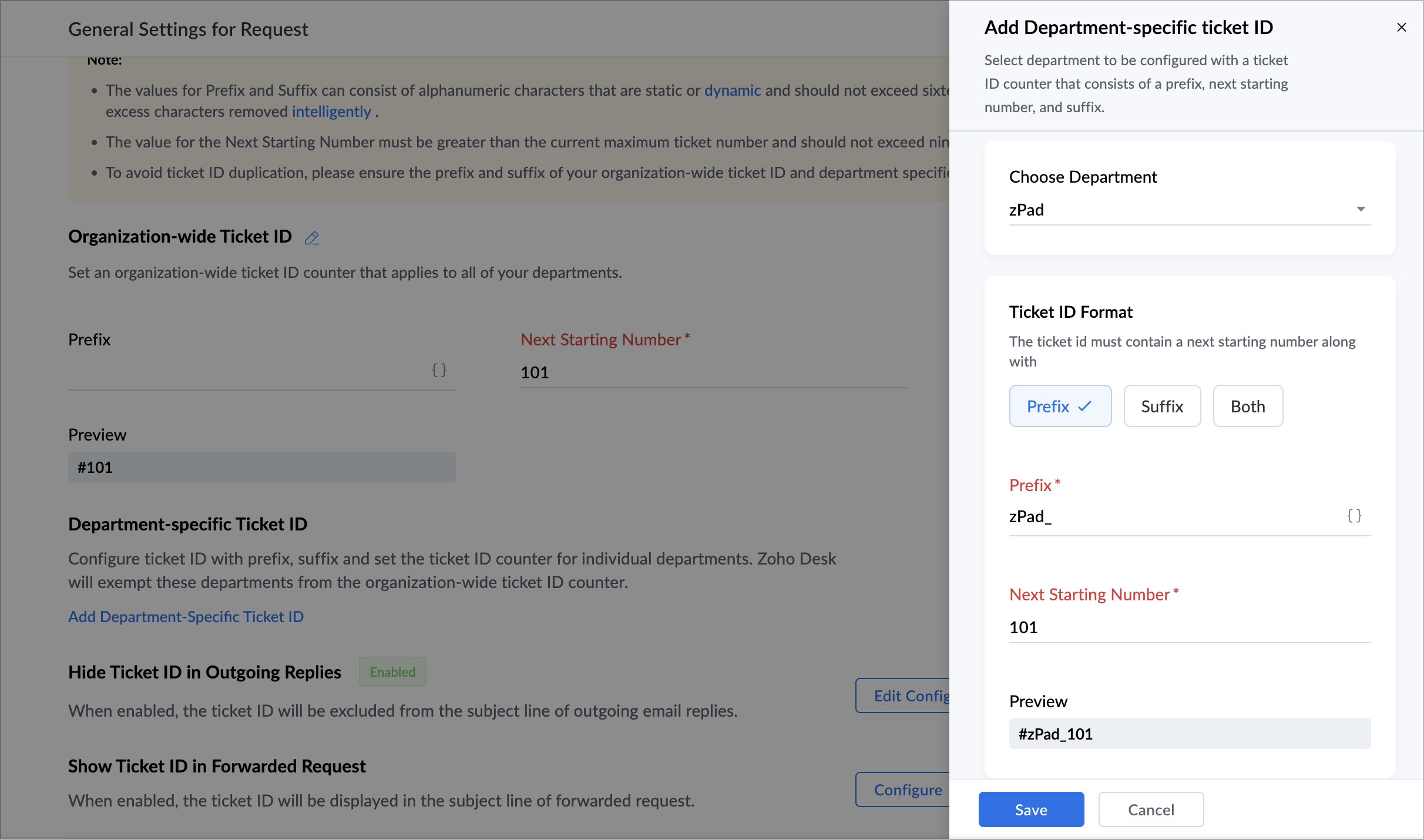Department-specific ticket ID settings help you add a separate ticket ID for each department. Let's say you have two departments in your organization, called Zphone and Zpad. The ticket IDs of these departments could be Zphone101 and Zpad101, respectively.