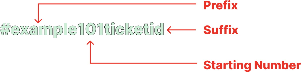 A ticket ID is composed of a starting number, prefix, and/or suffix; the latter two components are optional. A hash (#) symbol always preceds a ticket ID.