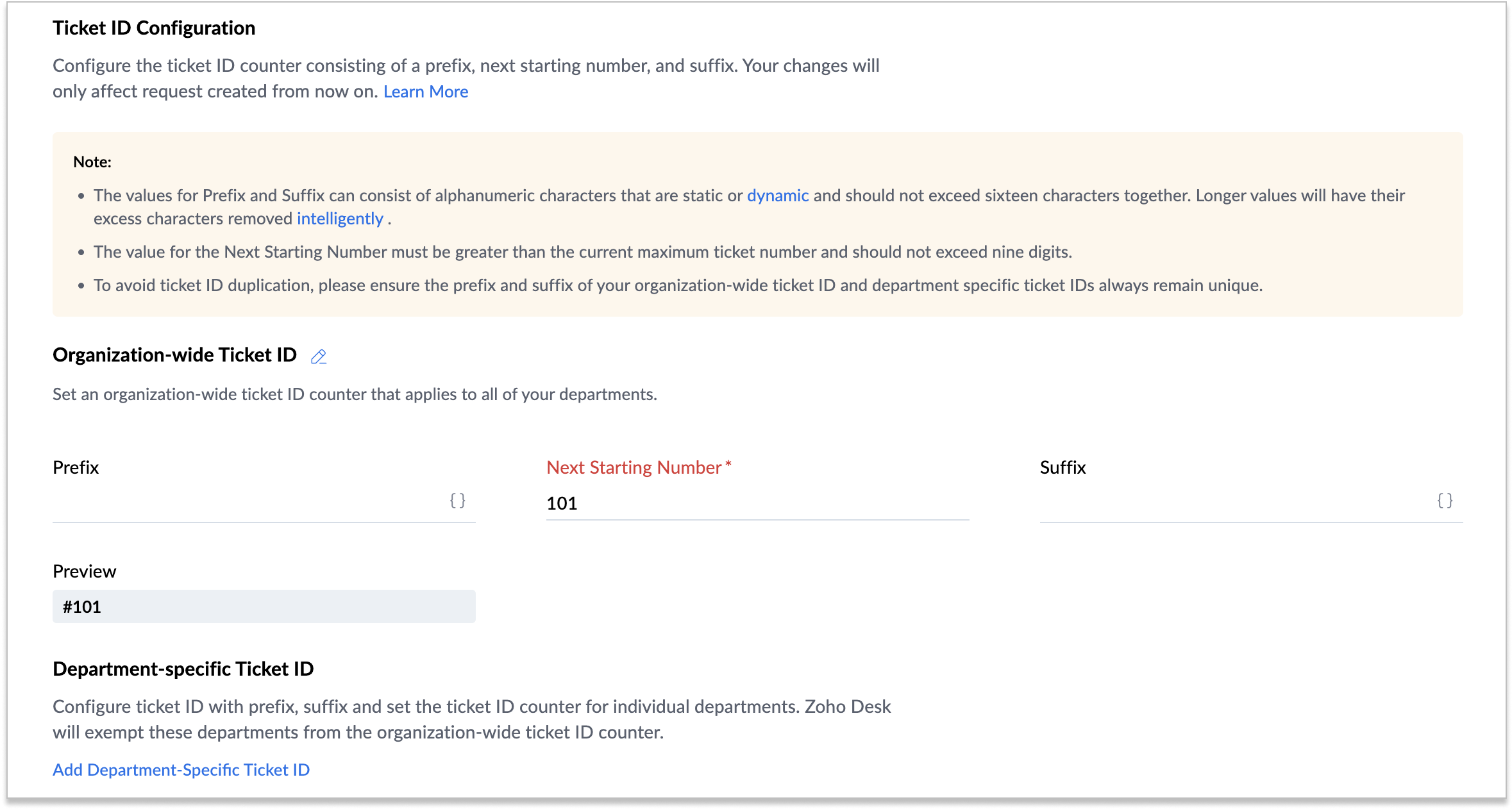 Note: The starting number series of a department-specific ticket ID cannot be the same as that of the organization wide ticket ID. Similarly, the starting number series of two department level ticket IDs cannot be the same as well.