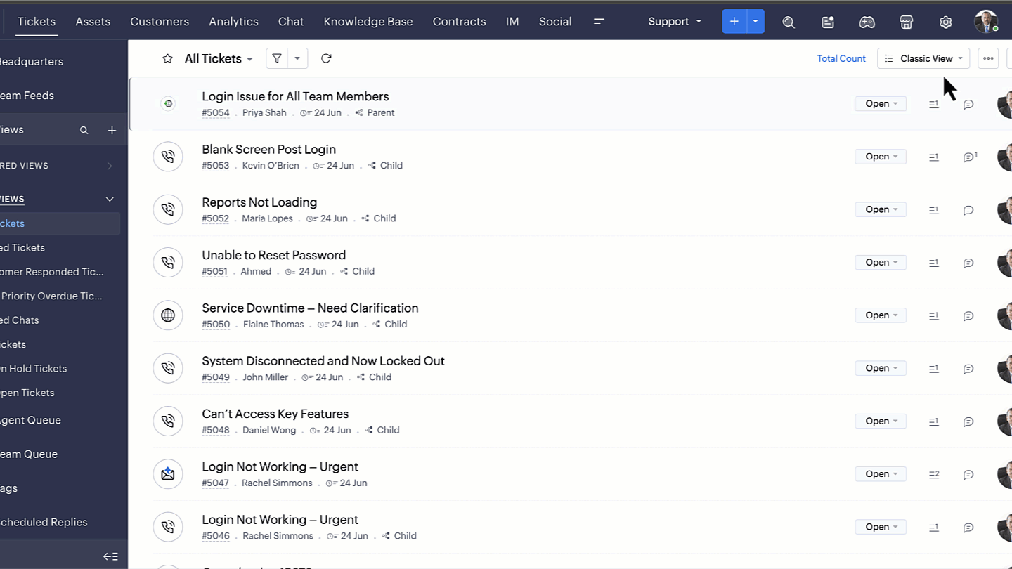- For admins, knowing the number of tickets in each work mode helps identify and anticipate peak hours and assign agents efficiently to manage the workload. For example, the admin notices a spike in the number of tickets under "Open" in Status mode on Monday mornings. By identifying this pattern, the admin can allocate resources accordingly for the Monday morning shift to prevent delay in response.