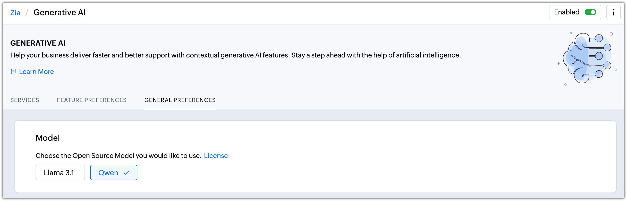- Zia - Llama 3.1 is the default model, admins can also choose Qwen.