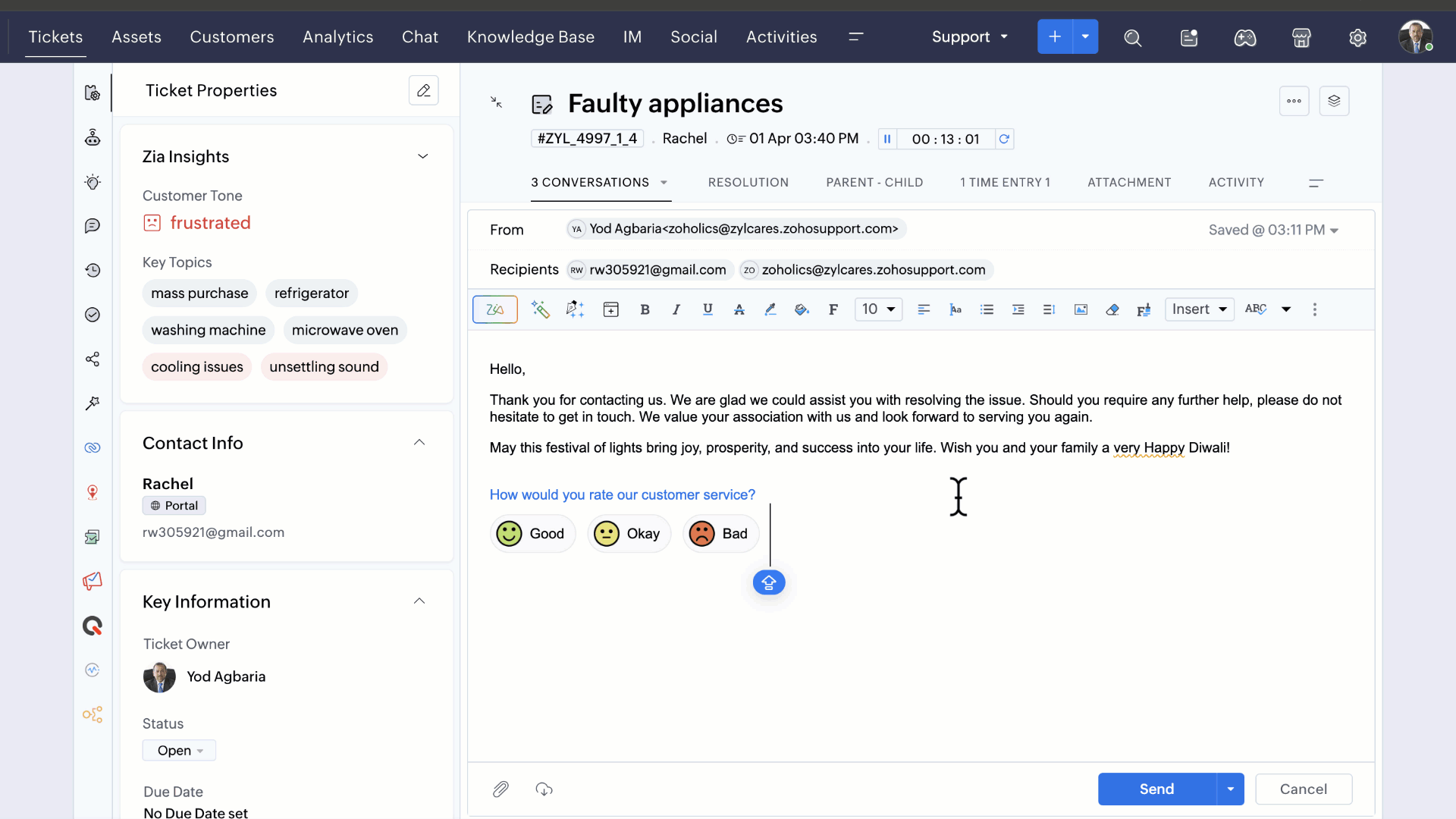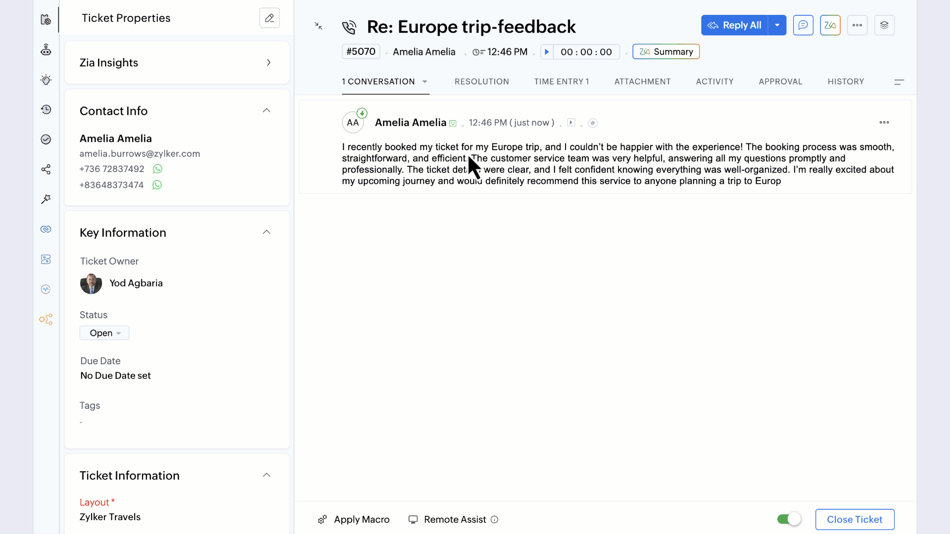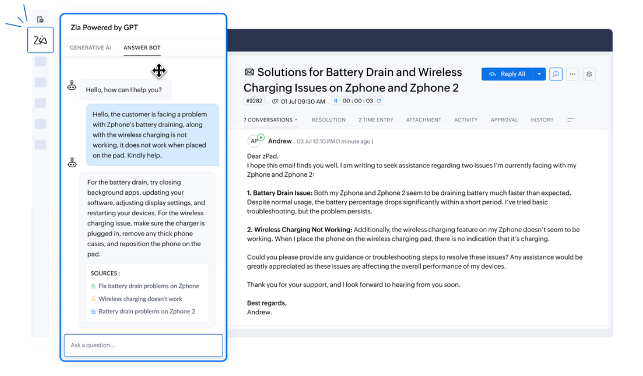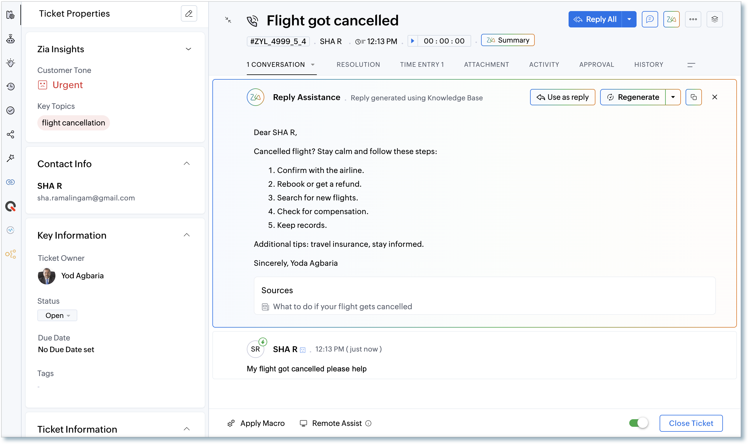 For example, if a customer reports a technical error, Zia suggests a troubleshooting response and links the corresponding article for quick reference.