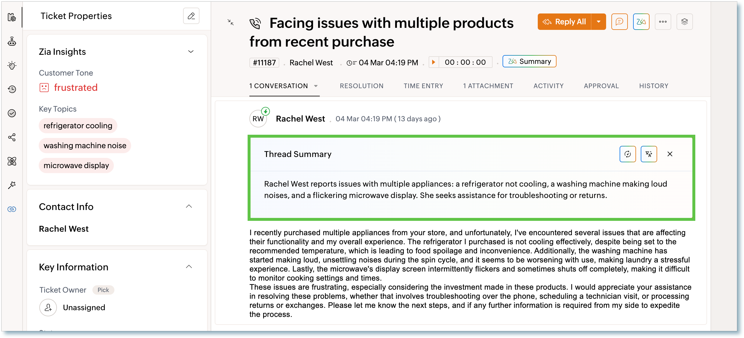 When a customer shares multiple concerns in one message, the Summarize Threads feature extracts and highlights the main points. This helps agents grasp complex queries faster and respond more effectively.