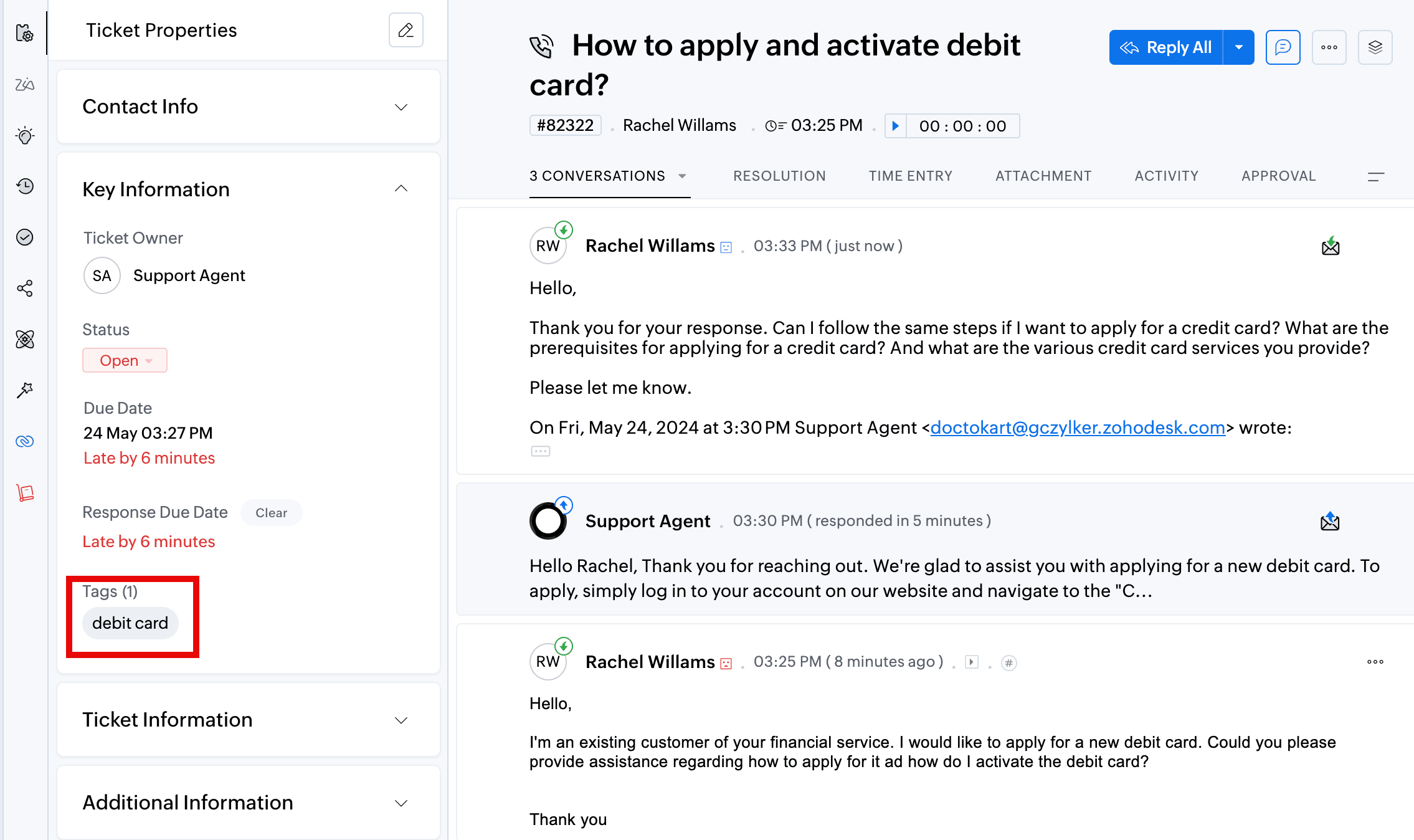 Zia automatically generates keywords for each customer response (thread) within a ticket, helping agents quickly understand the core context of the entire conversation. This is especially useful for tickets that involve multiple teams or lengthy back-and-forth discussions, as well as in cases where the ticket has been shared with other agents who can find it challenging to draw context from long conversations.