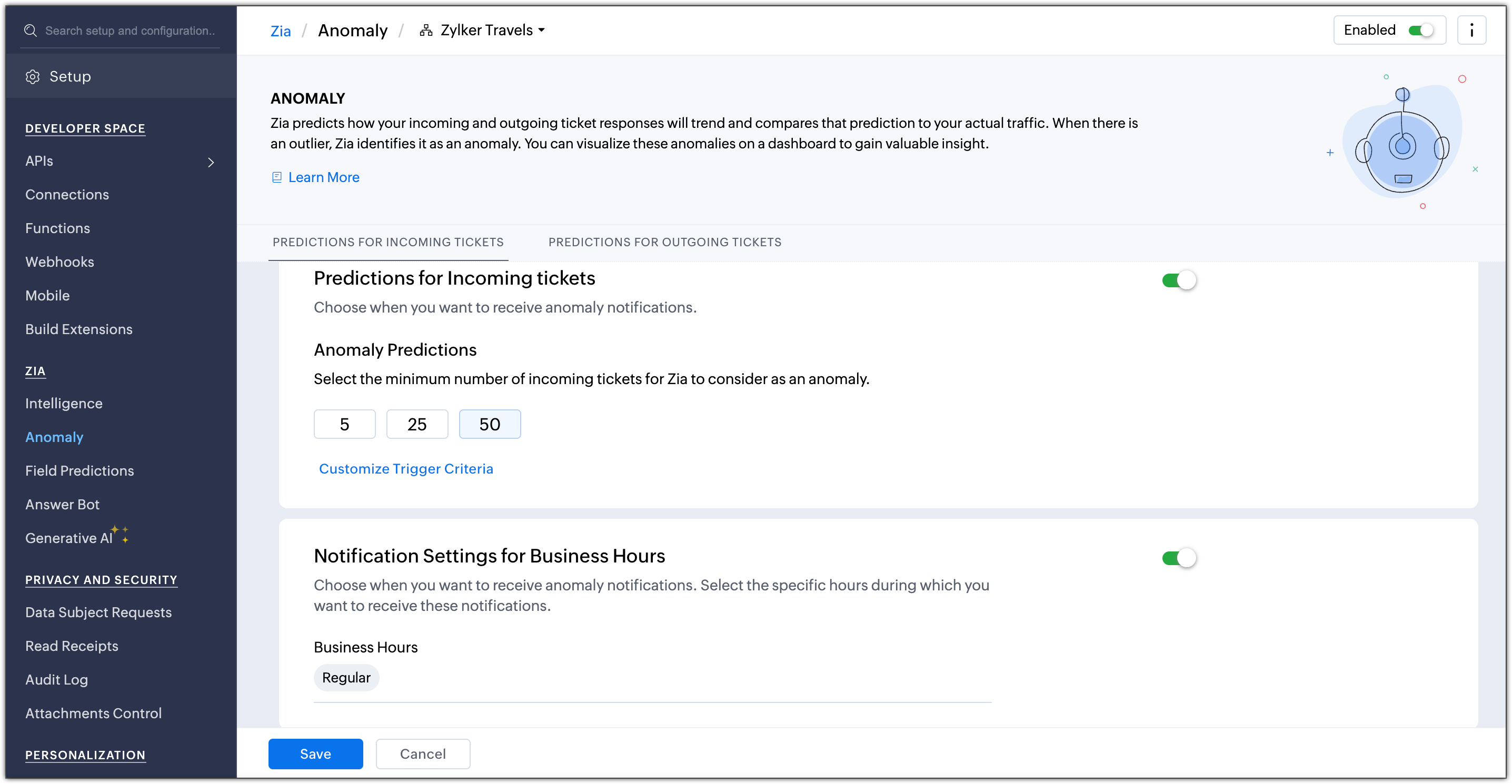 - Select the minimum number of incoming/ outgoing tickets for Zia to consider as an anomaly 5,25,50. OR