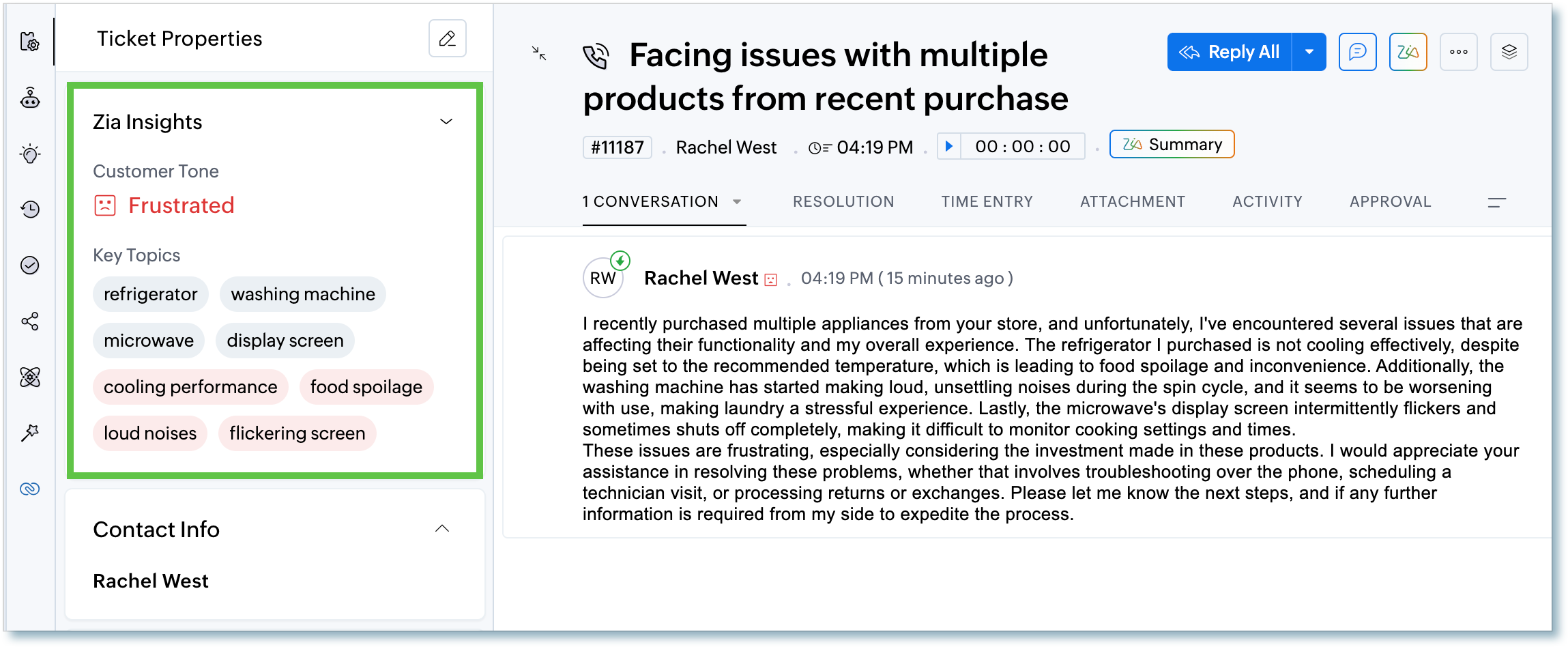 Zia insights is a set of three features that help agents better understand the ticket conversation.