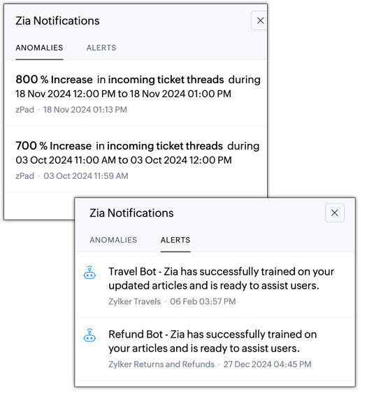Zia proactively monitors your help desk for anomalies in ticket traffic—like sudden surges or dips—as well as alerts related to system activities such as Answer Bot training, Auto-tag creation, and Annotated ticket status updates. When triggered, a red icon appears in the notification panel at the bottom of the screen to bring these insights to your attention.