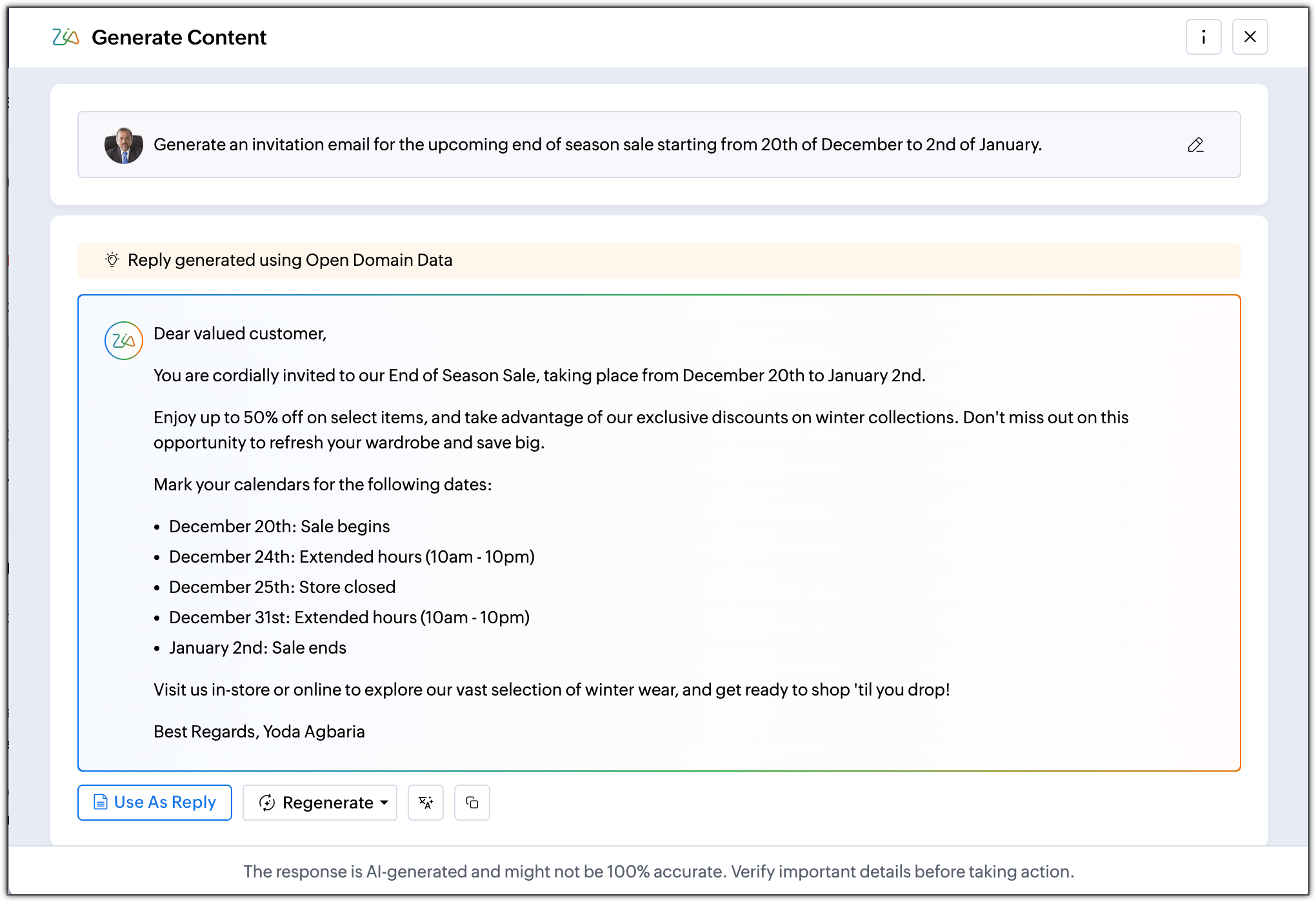 Zia uses Knowledge Base and open domain data to draft the content. Agents can edit, regenerate for different tone, length, and even translate it into Zia supported language before using it in reply. Read more on