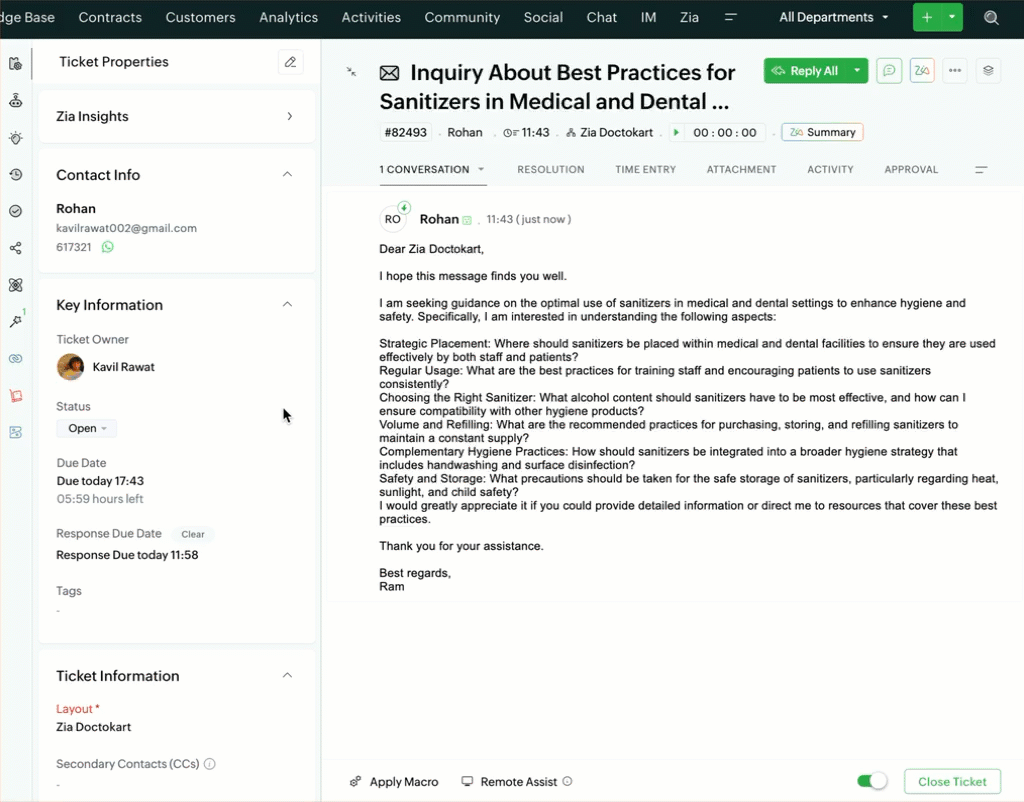 Zia can analyze the incoming tickets and predict values for the above fields based on its learning from past tickets that are present in the database. If Zia's prediction matches the accuracy score, then it will auto-update the predicted value in the respective fields.