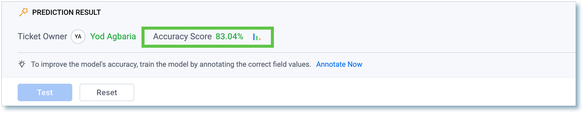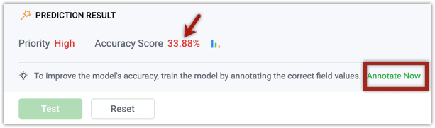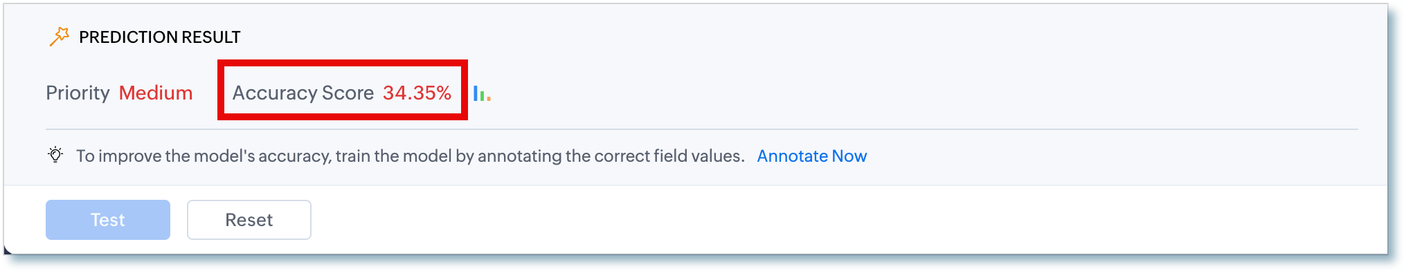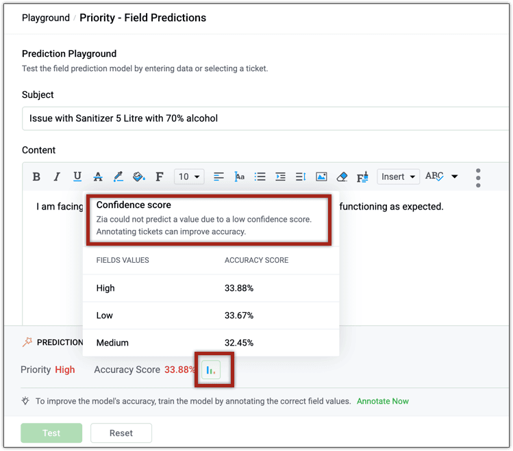 - If the accuracy score for a tested ticket is less than the confidence score, agents can manually annotate the right field values and then retrain Zia for future predictions.