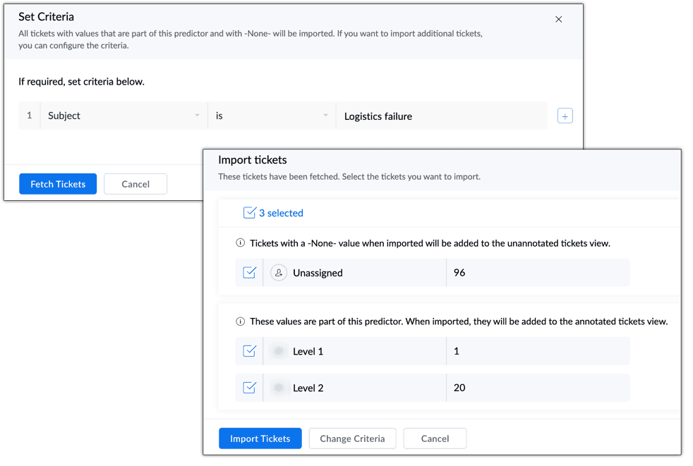 - Selecting tickets to import: You can import both annotated and unannotated tickets. When a picklist field that needs to be predicted has the "None" value, its tickets are referred to as unannotated. For example, if you are predicting the ticket owner, all the tickets where Zia couldn't predict an owner and left the field empty will be listed under the Unannotated Tickets tab. Likewise, if an agent is unsure of the severity level and has not chosen a value for the field, will have the ticket listed under the Unannotated tab.