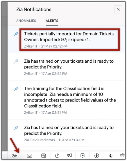 - Click on Zia Notiifcation icon from the bottom panel to view the import status under the Alert tab.
