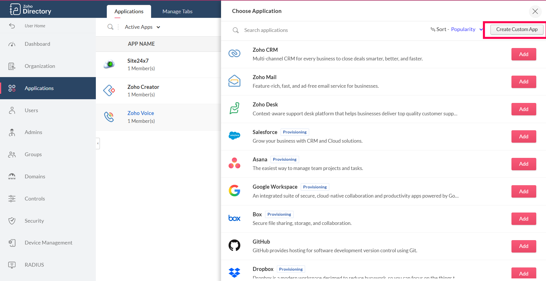 Note: Check our app directory to see if the app you need is already integrated with Zoho Directory, or request an integration.