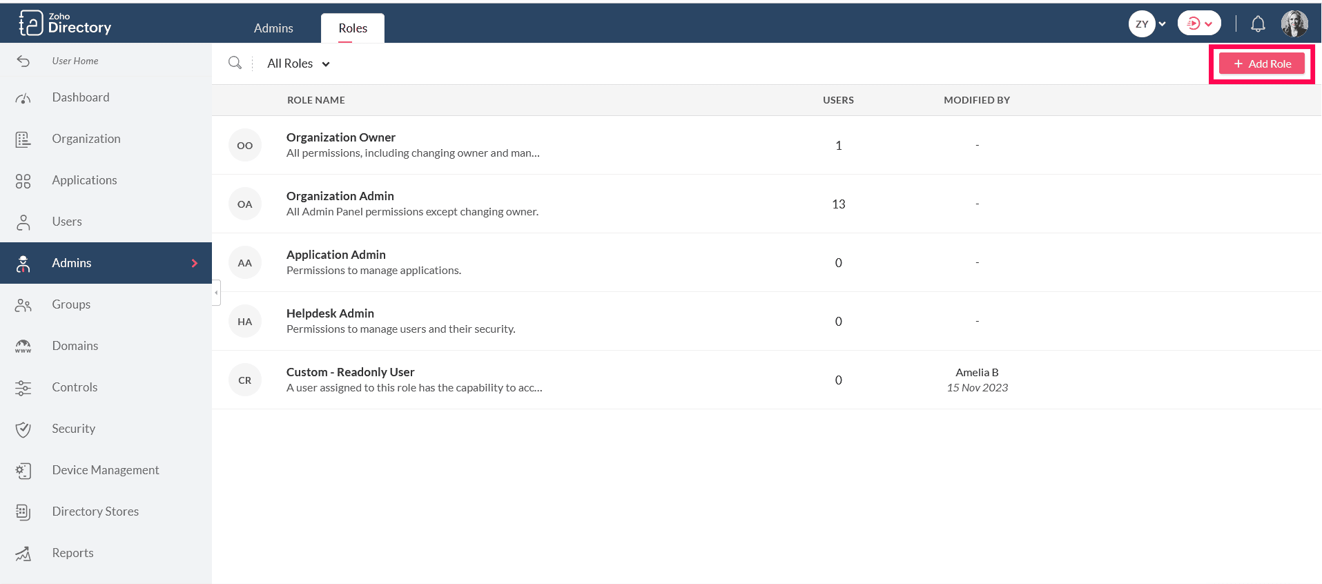 Prerequisites Roles required to perform this action: Organization Owner or Organization Admin Edit Role: Sign in to Zoho Directory, then click Admin Panel in the left menu. Go to Admins, then click Roles next to the Admins tab in the top. Click on ...