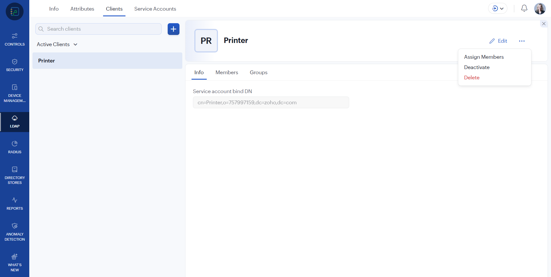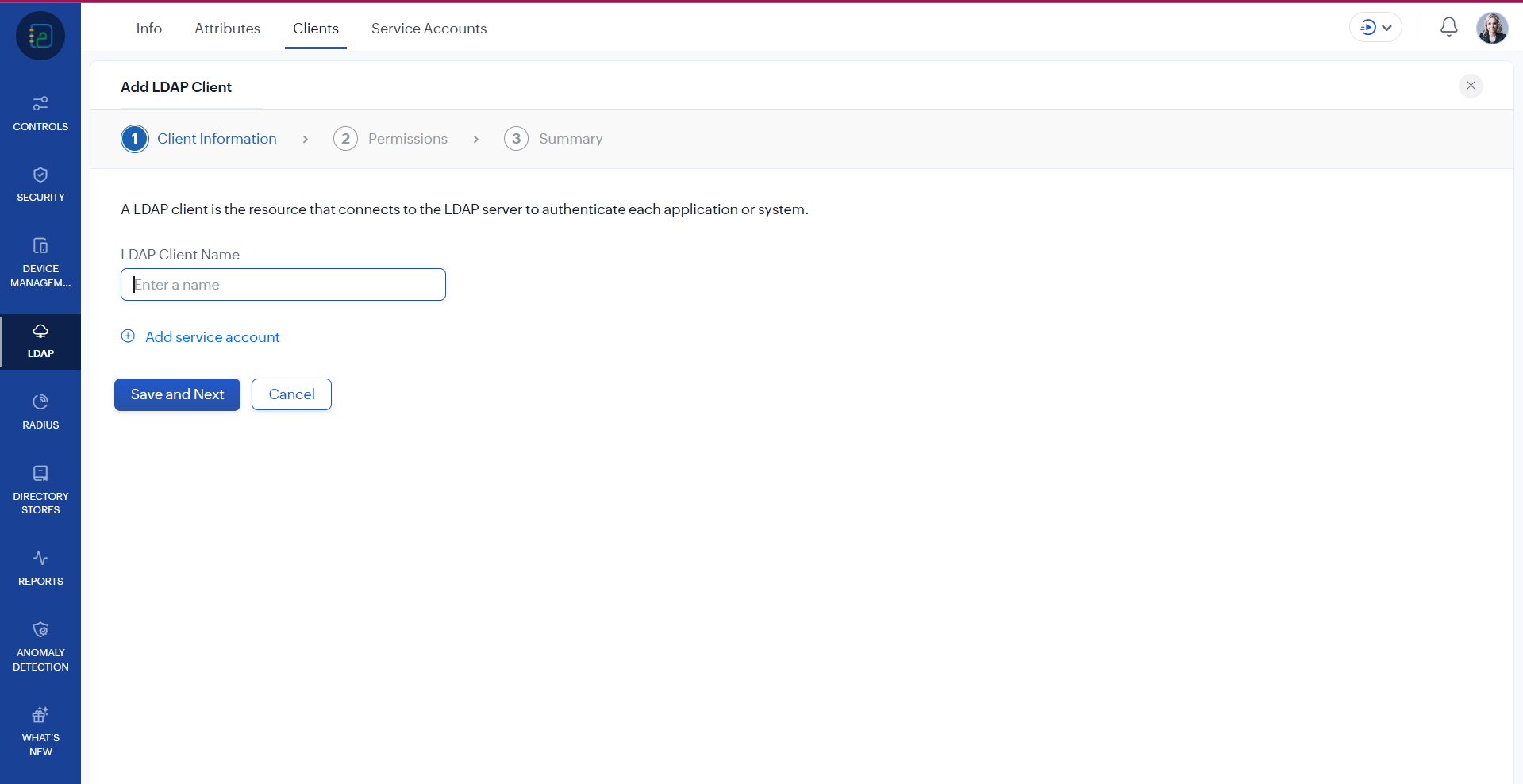 A service account in Cloud LDAP is an account created in Zoho Directory solely for enabling applications to connect to the directory and perform authentication and directory lookup operations in a secured way. It is used by applications or services (like Jira and VPN servers) to bind to Cloud LDAP. In LDAP terms, this is usually the BindDN (distinguished name) + password that the application uses.To set up and manage Cloud LDAP, you'll first need to add LDAP clients to Zoho Directory (eg., printers, Atlassian Jira), configure access permissions for each client, and connect them to the Cloud LDAP service.