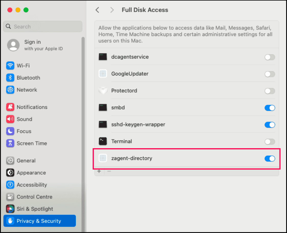 8. Alternatively, you can drag and drop the zagent-directory file directly into the Full Disk Access window. The binary will not appear in the Full Disk Access list even after adding it. This is expected behavior. The installation will automatically resume once the permission is applied.