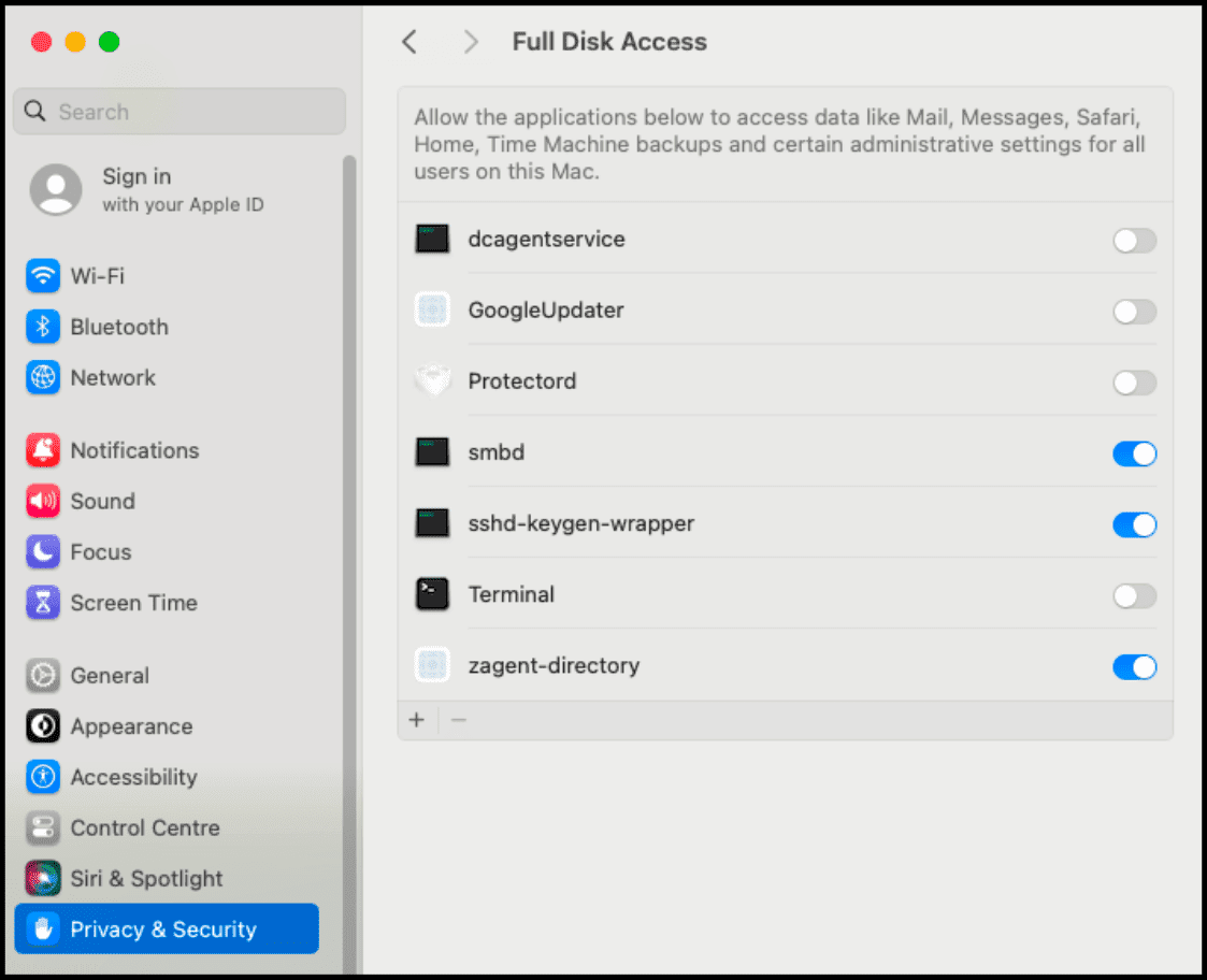 4. Grant full disk access to zagent-directory in System settings when prompted.