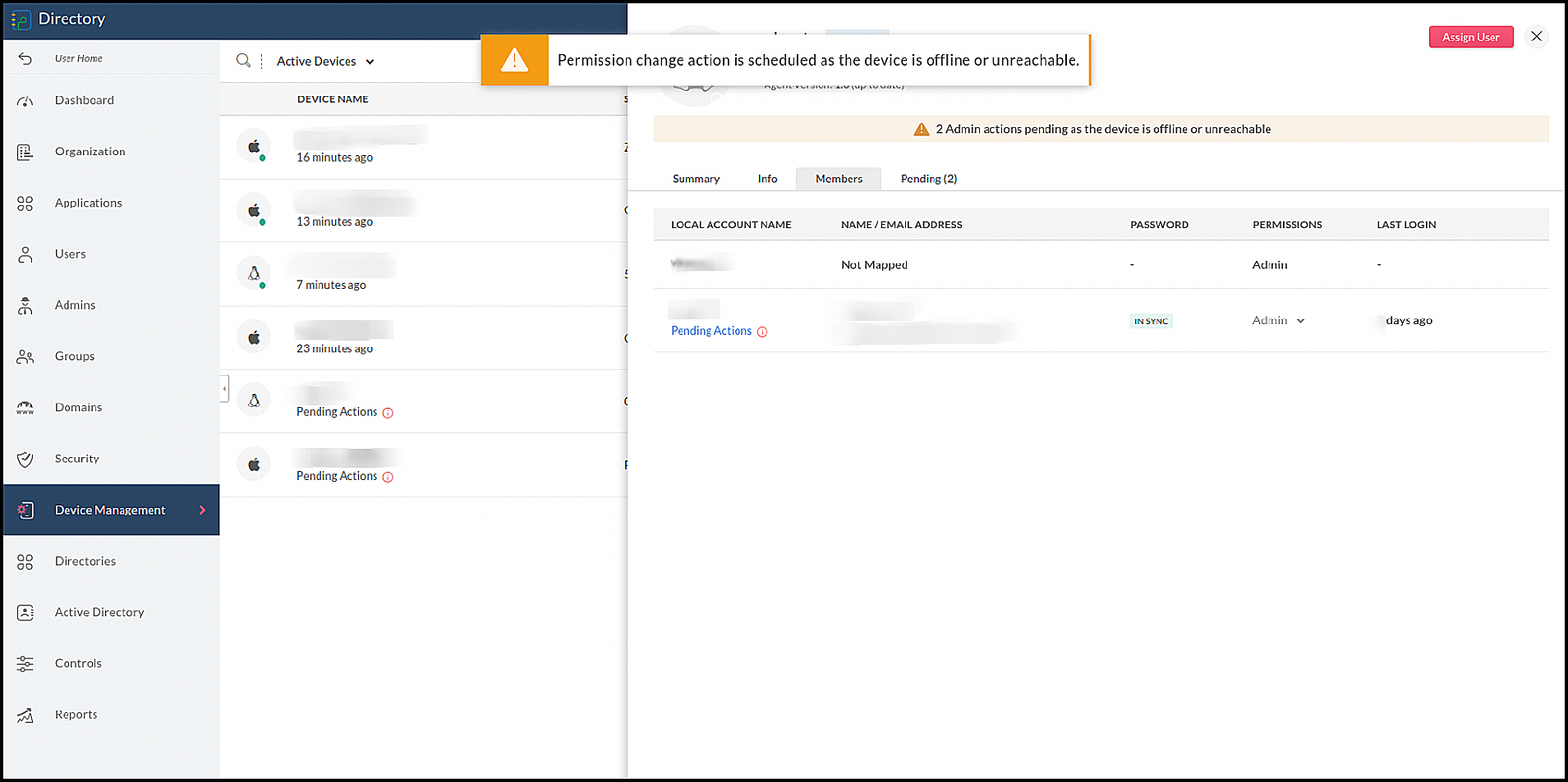 Prerequisites Roles required to perform this action: Organization owner Organization admin To assign a Directory user to an enrolled device, Click the required device. In the displayed pop up, click Assign User. Select the user you want to assign to ...