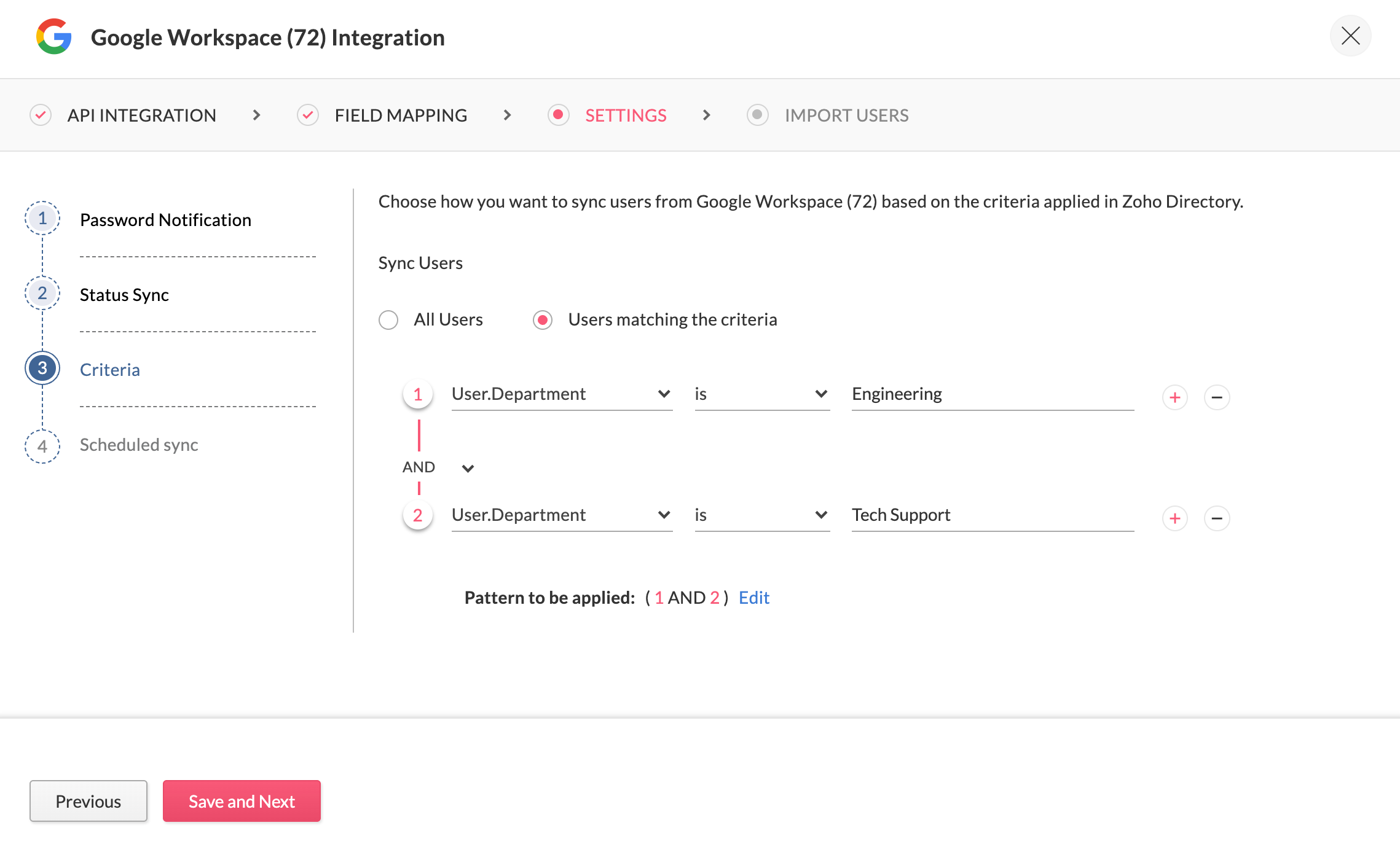 - Under Criteria, choose how you want to sync users from Google Workspace. You can either sync all the users or few users based on criteria in Zoho Directory.