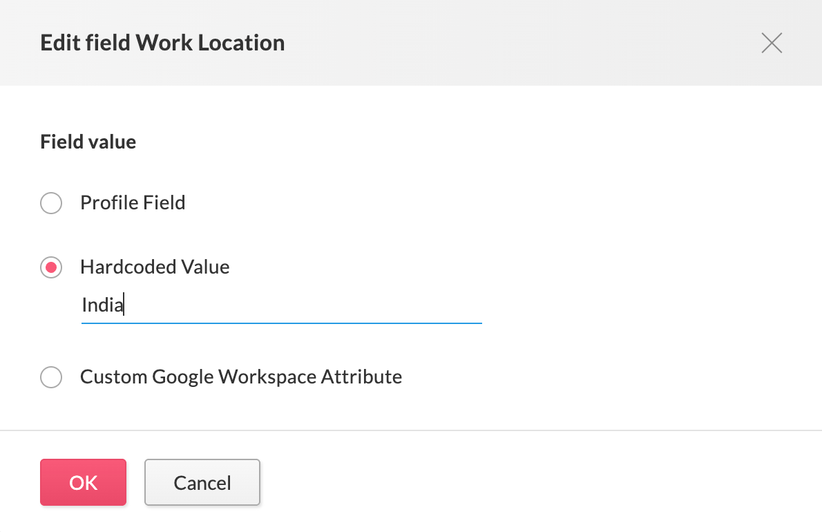 You can choose to map fields from Google Workspace with a hard-coded value in Zoho Directory. For example, you can configure the work location for all users synced from Google Workspace to be 'India' in Zoho Directory. To do this: