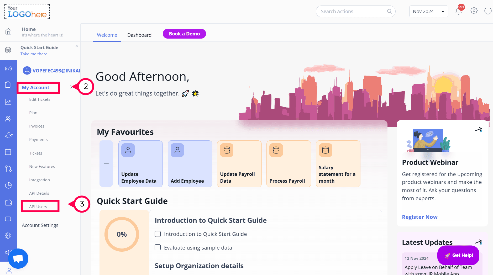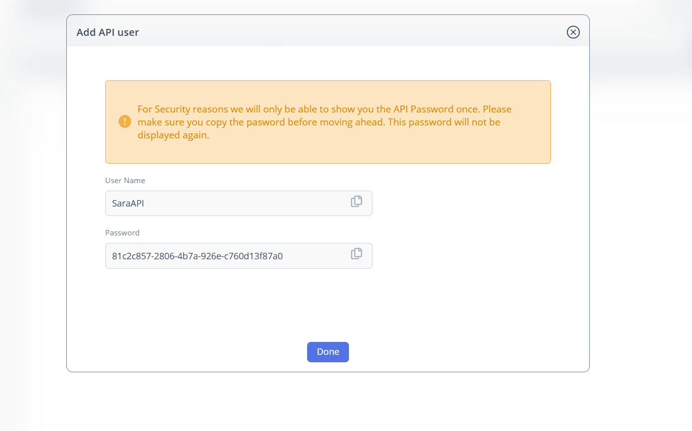 On the API Integration page, enter the domain name, and the user name and password copied from your greytHR account. (To copy user name and password, follow the steps from greytHR section below)
