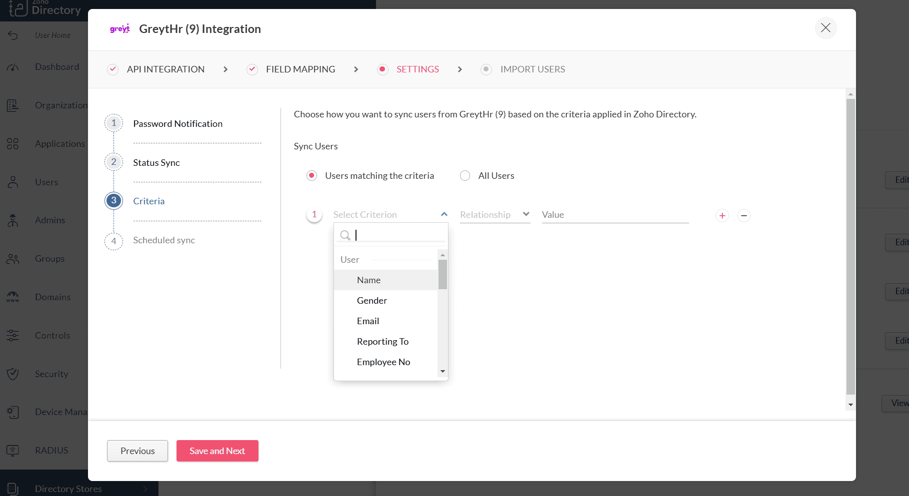Choose how you want to sync users from greytHR. You can either sync all the users or few users based on criteria in Zoho Directory. You can also set multiple criteria based on your needs.