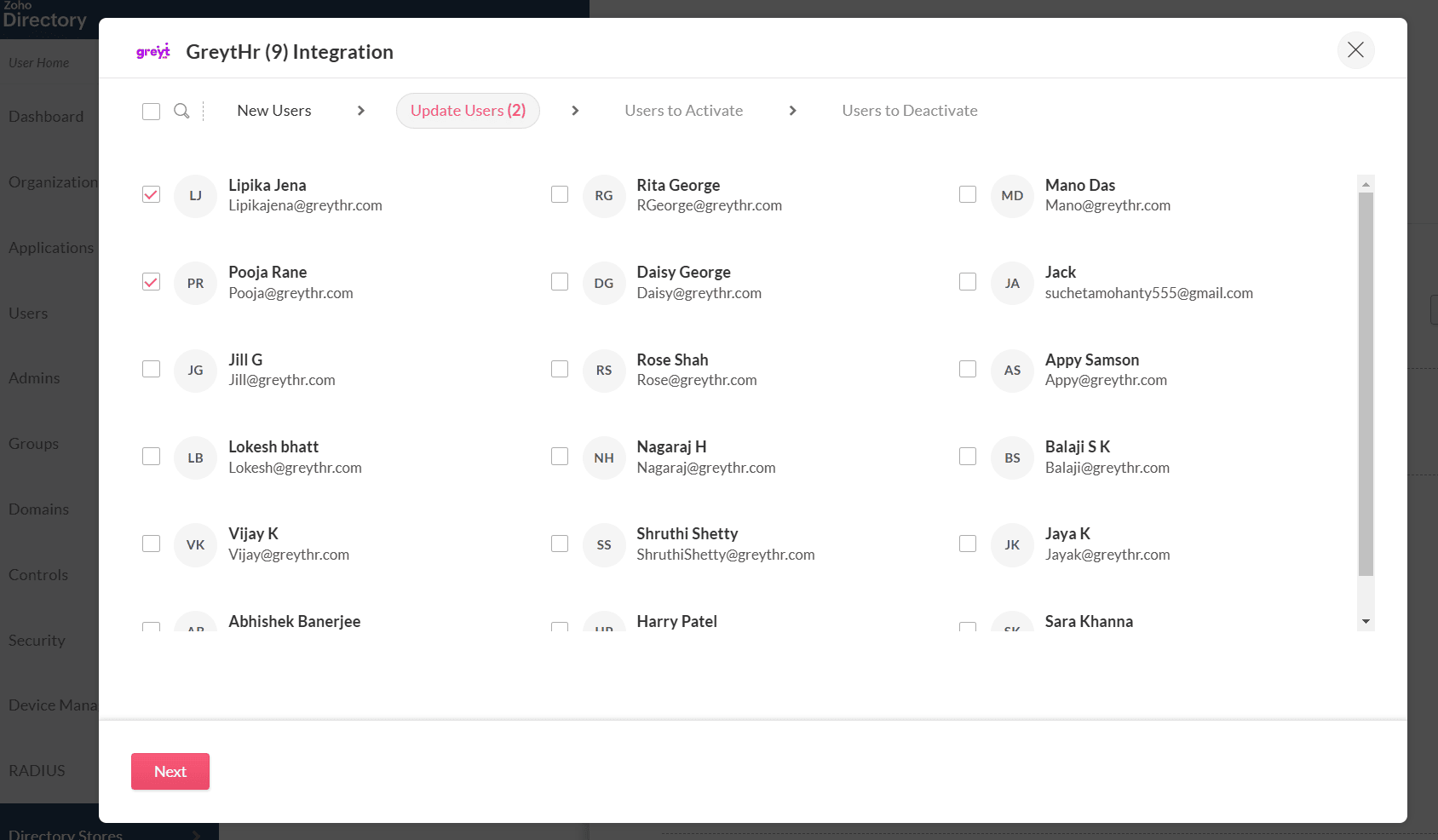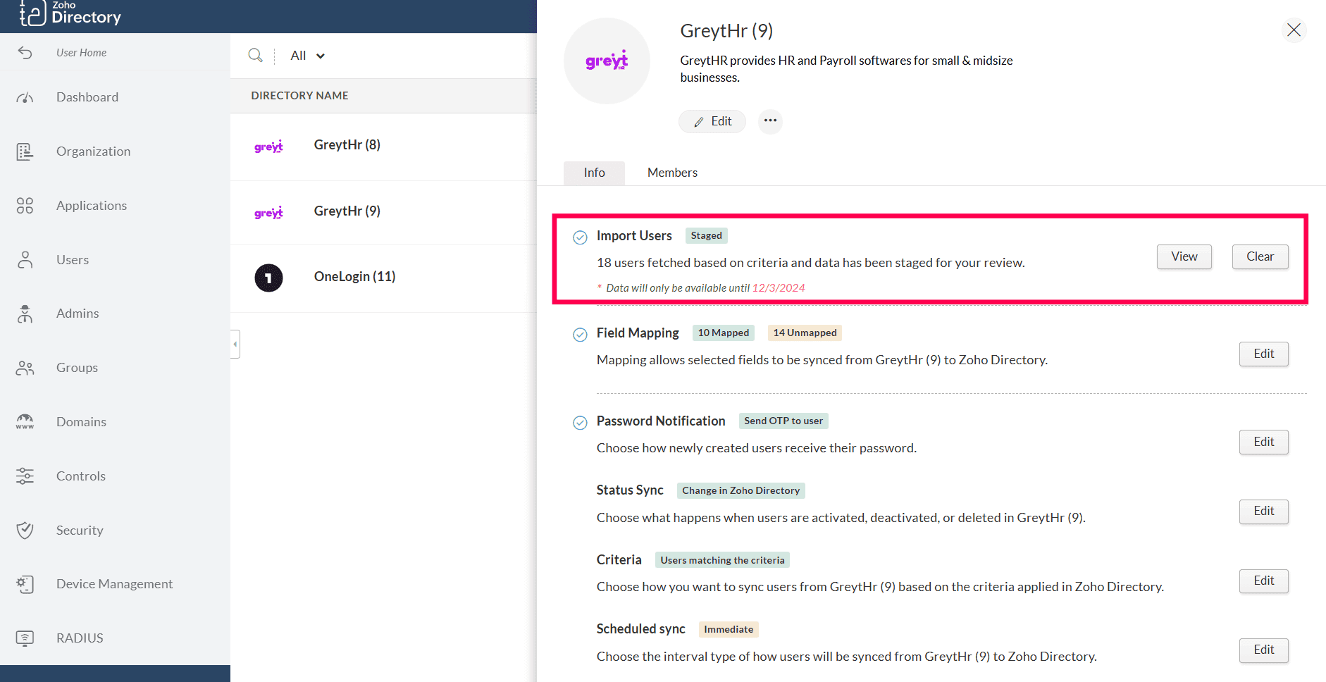 Import Users: greytHR now allows bulk import of users into Zoho Directory. All users (except deleted users) will be fetched and shown depending on the chosen criteria. Once you have selected users, they will be staged, and it might take time to list the users. Once finished, you can either view it or clear it for re-import.