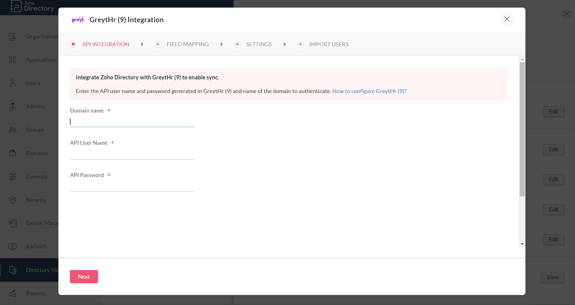 Once done, click Next. Copy the user name and password to paste them on the Zoho Directory page (Follow the 4th step in Zoho Directory section above).