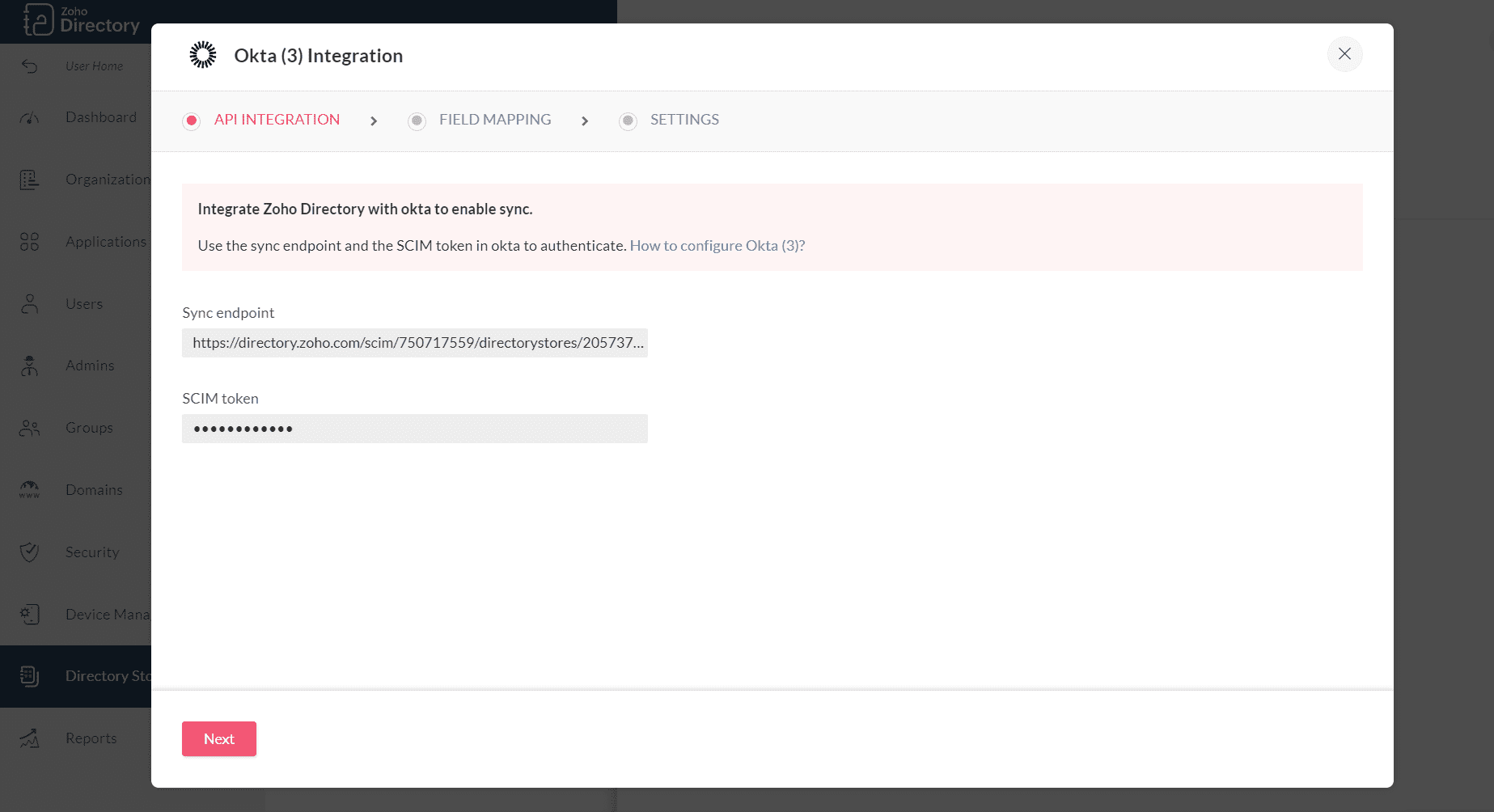 Under API INTEGRATION, note down the Sync endpoint and SCIM token. Later, you'll need to provide this information in Okta to enable sync.
