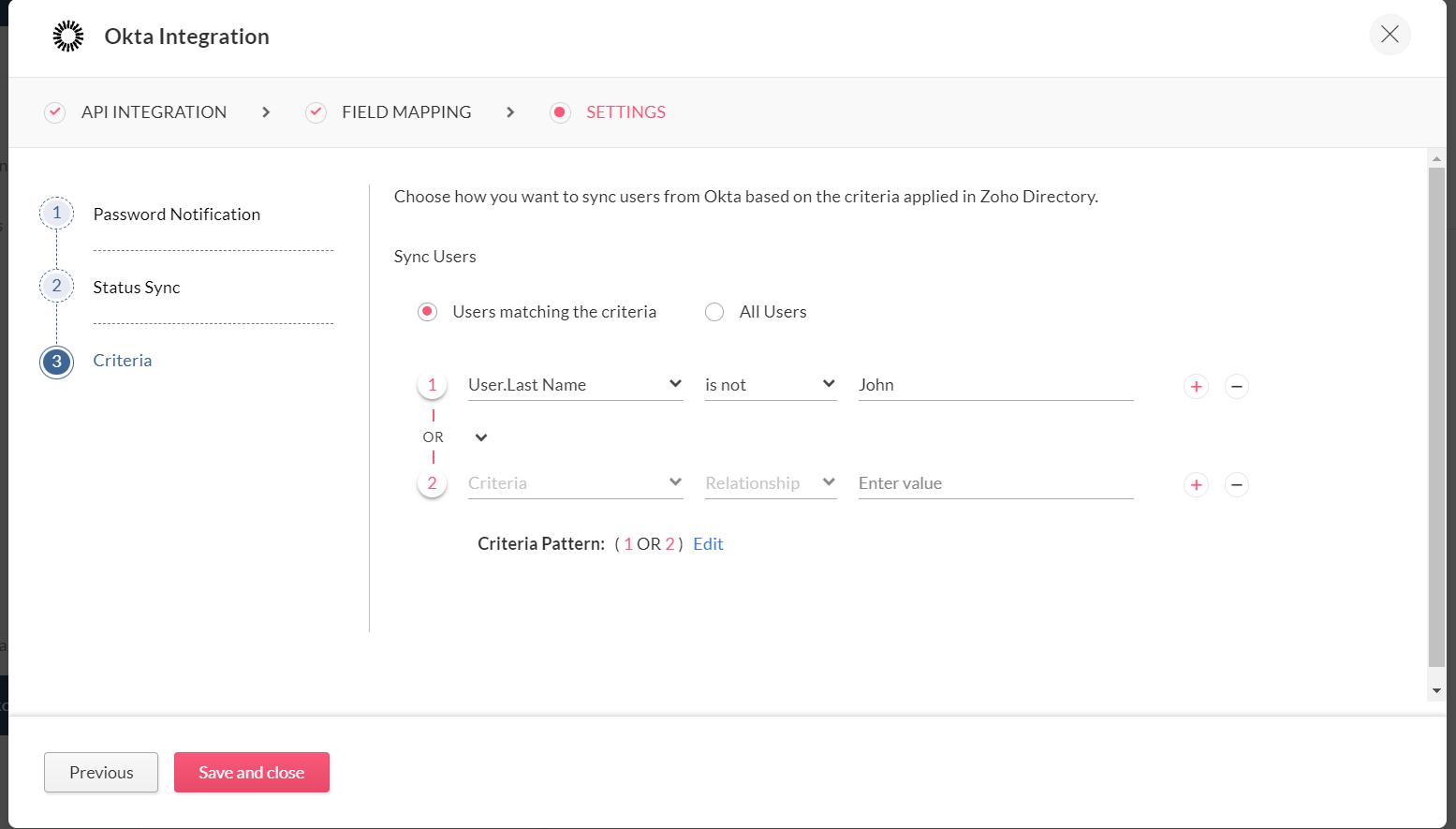 Choose how you want to sync users from Okta based on the criteria applied in Zoho Directory. You can either choose to sync users for a few users matching the criteria or all users. You can use custom attributes to set criteria. You can also set multiple criteria based on your needs.
