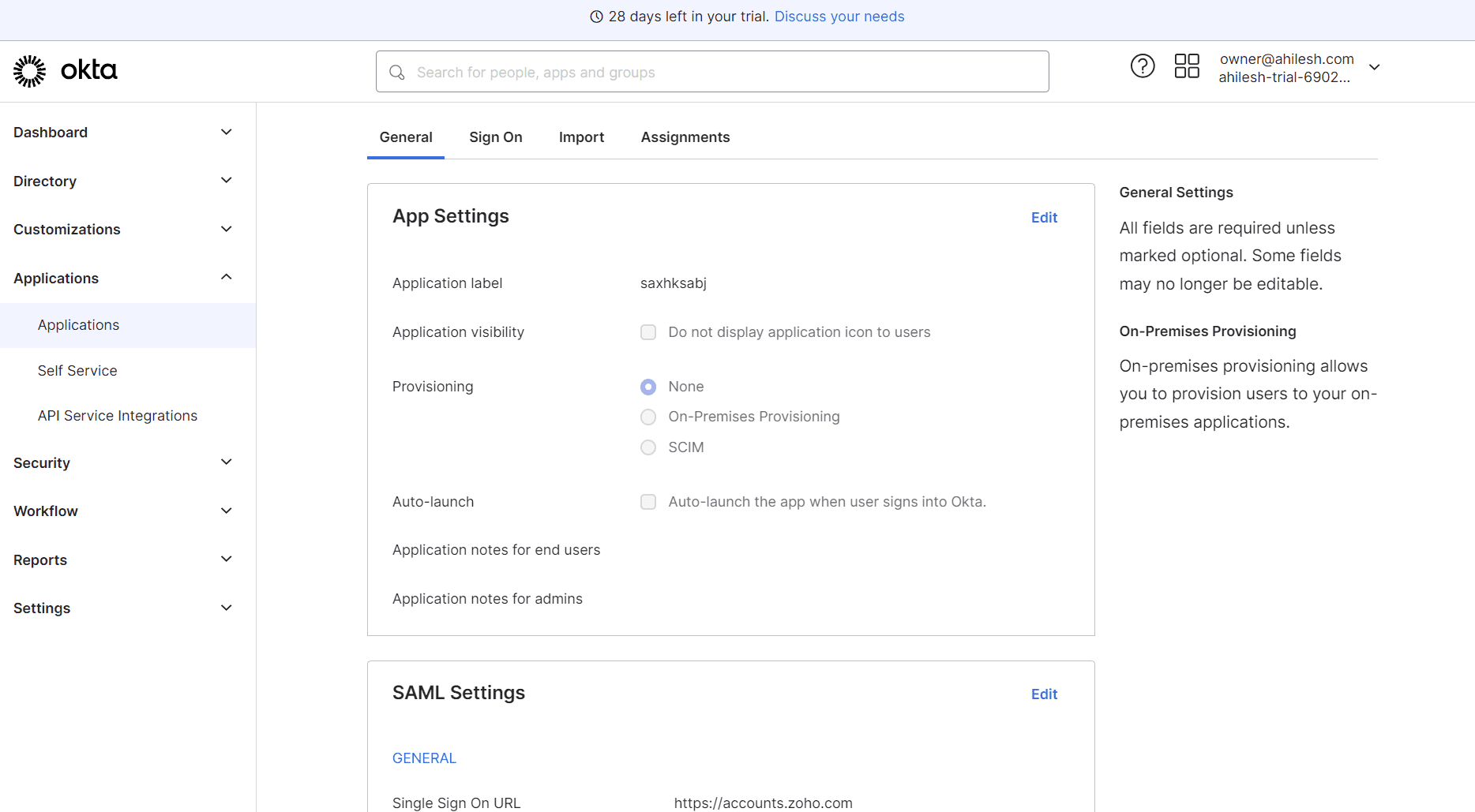 Go to General tab, click Edit under App Settings, and change Provisioning option from None to SCIM. Once you're finished, click Save.