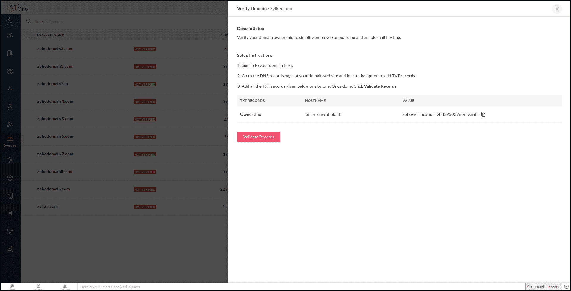 Note: If you are verifying a subdomain, enter the subdomain name. For example, the host name for "zo.zylker.com"will be "zo".