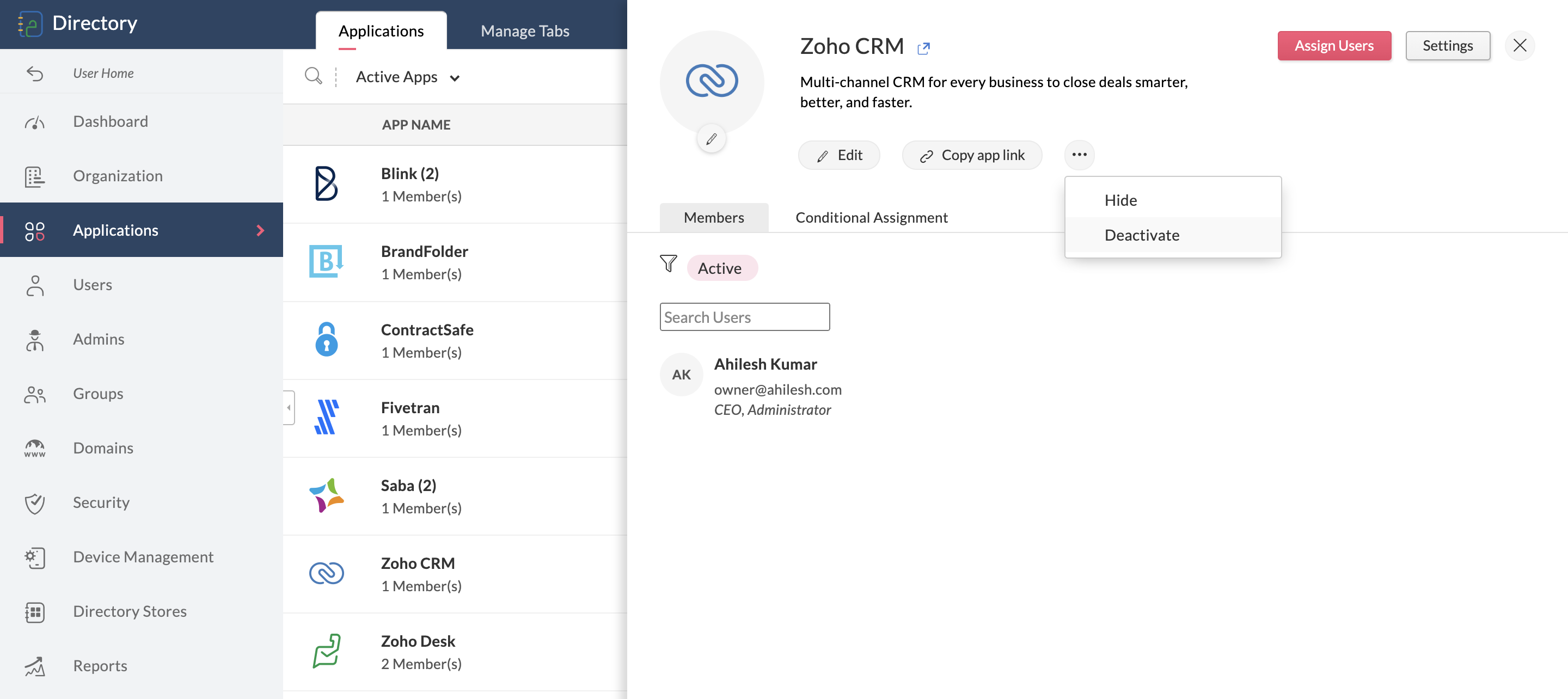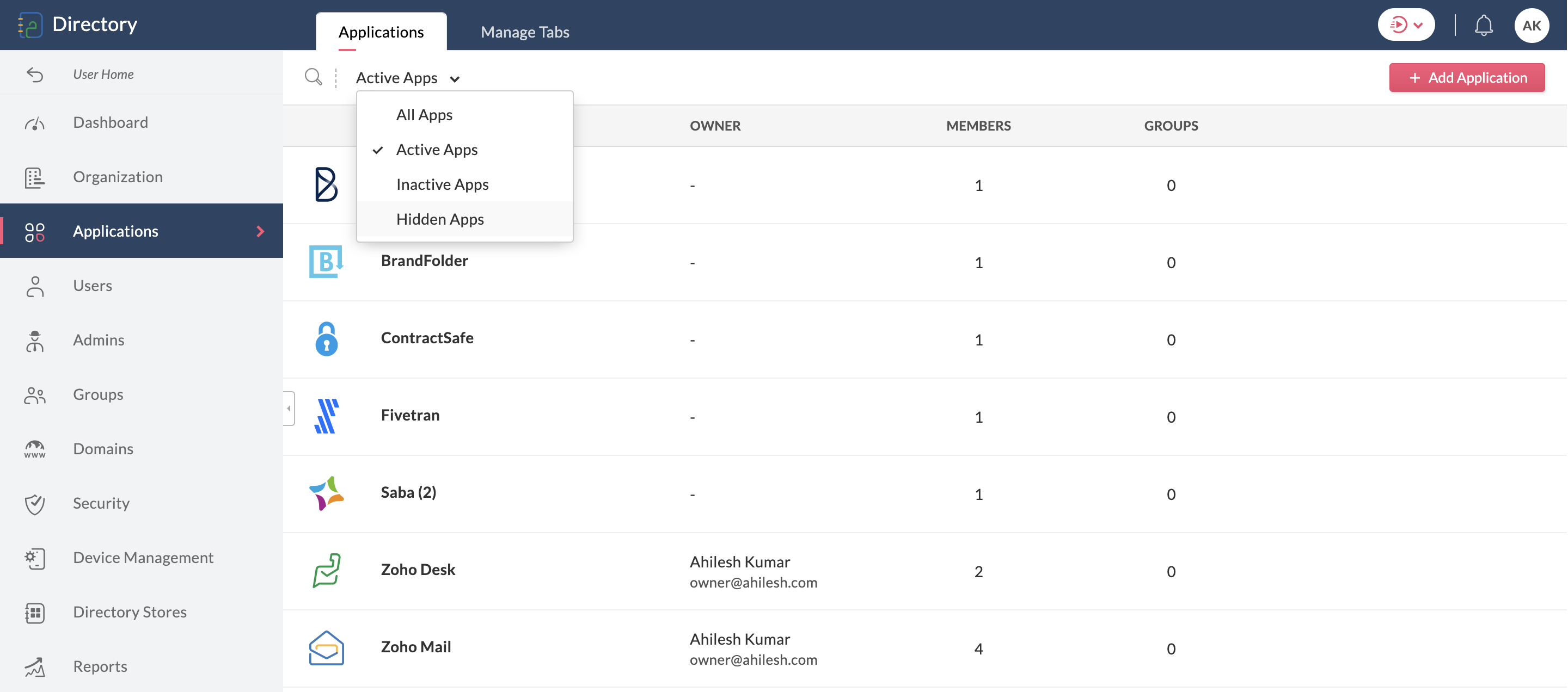 Applications - Hide/Unhide App | Admin Guide - Zoho Directory