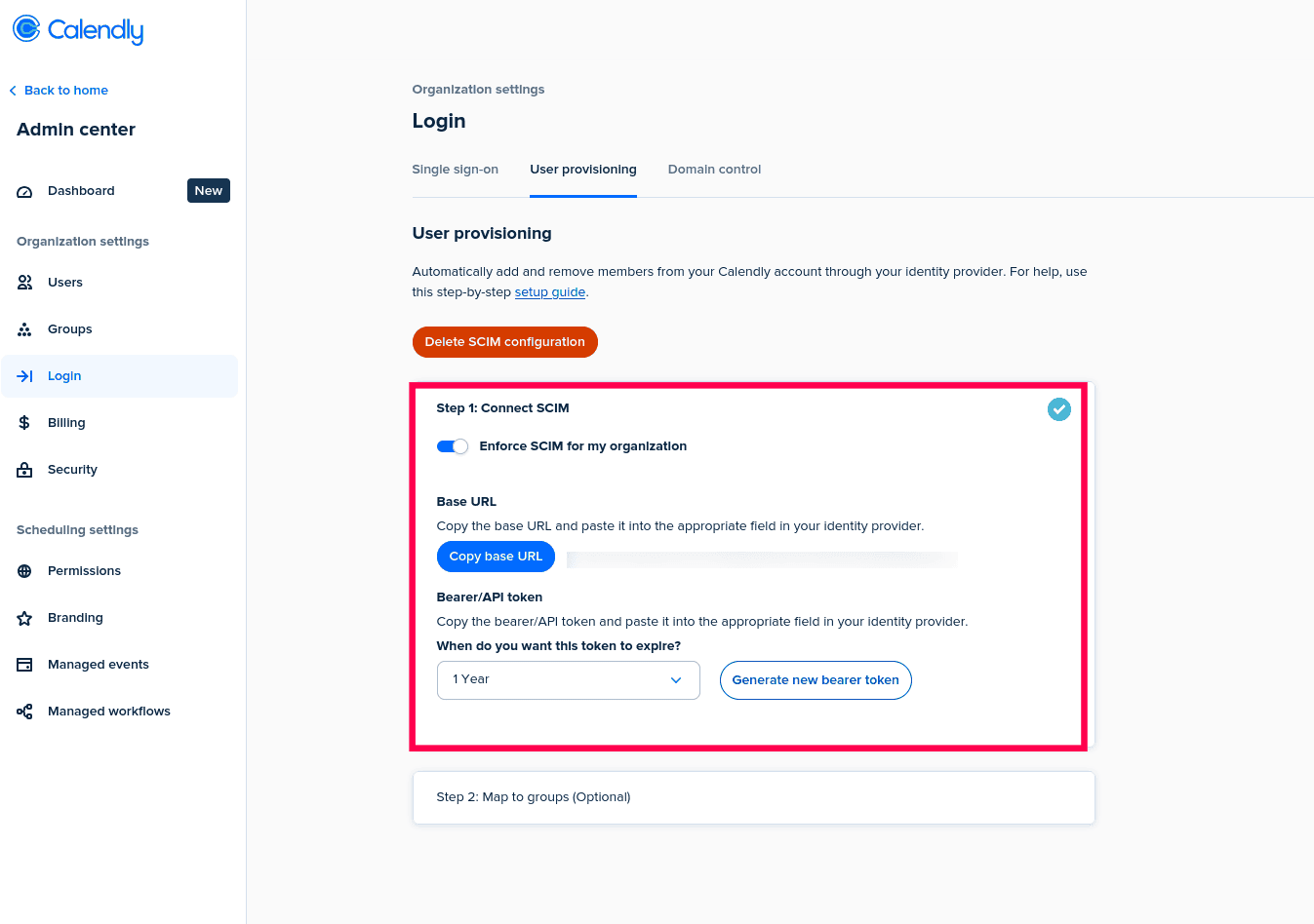 6. Paste the base URL and bearer token copied from Calendly under the Sync endpoint and SCIM token fields, respectively.