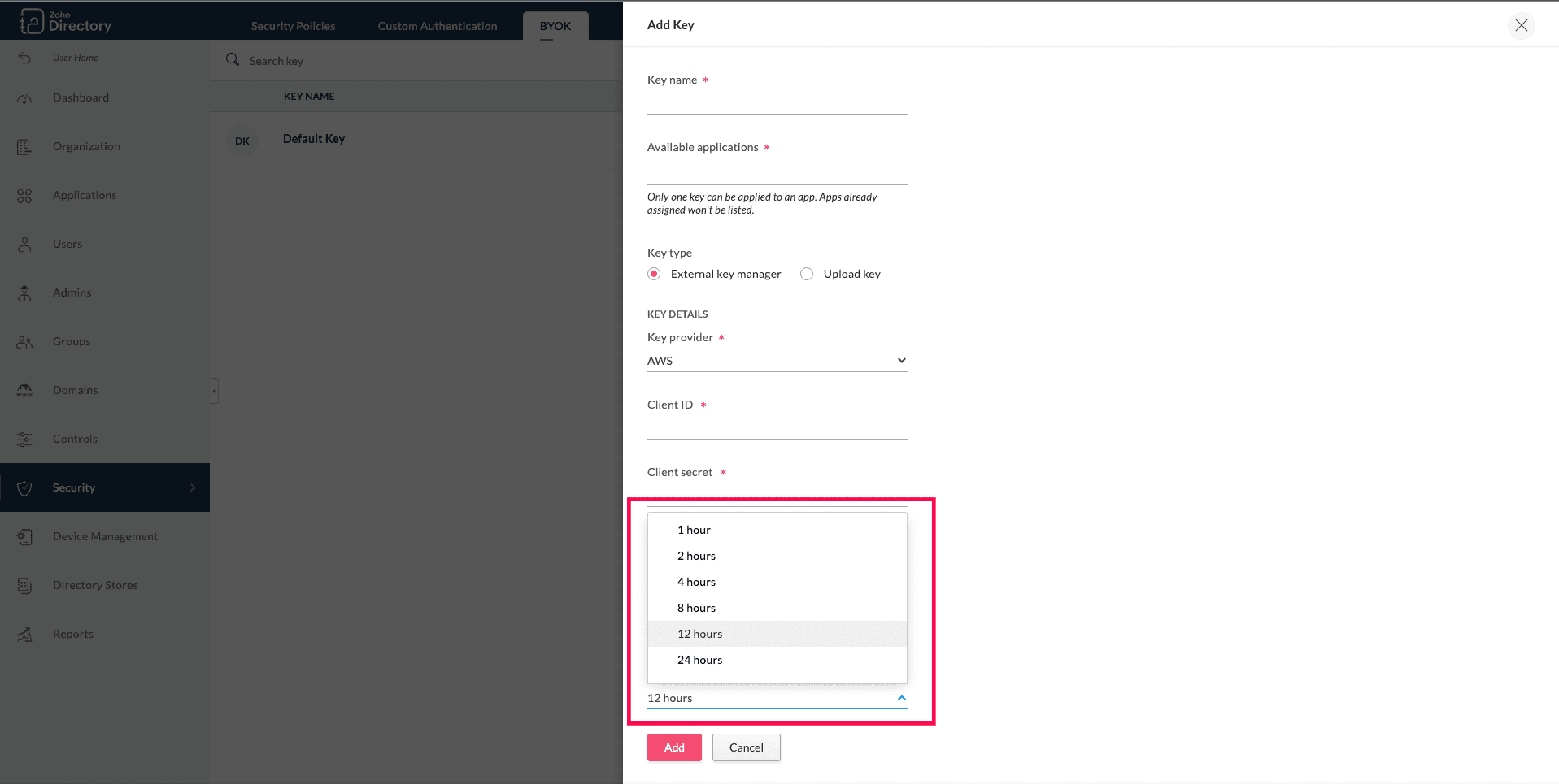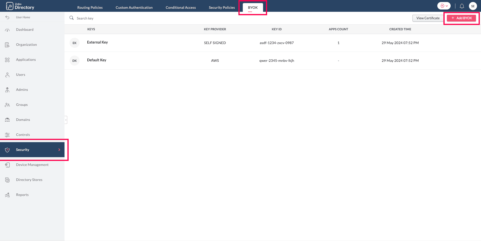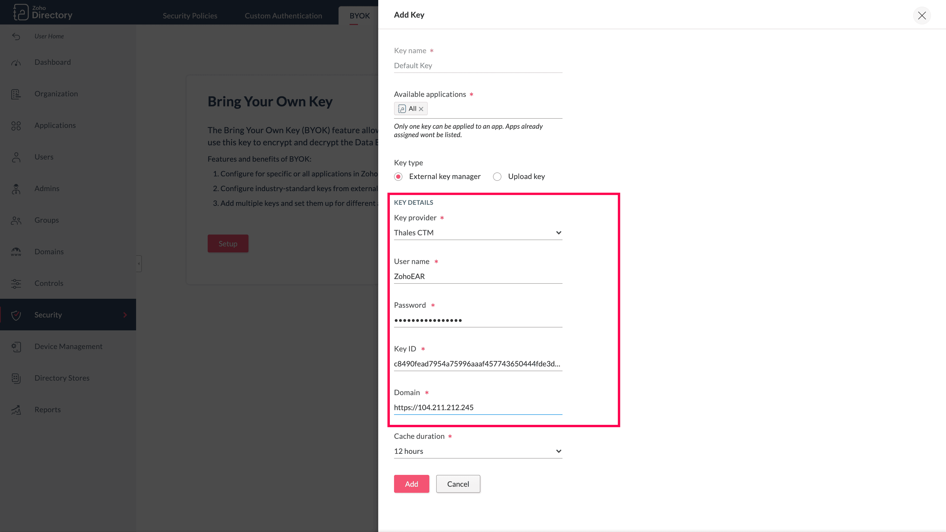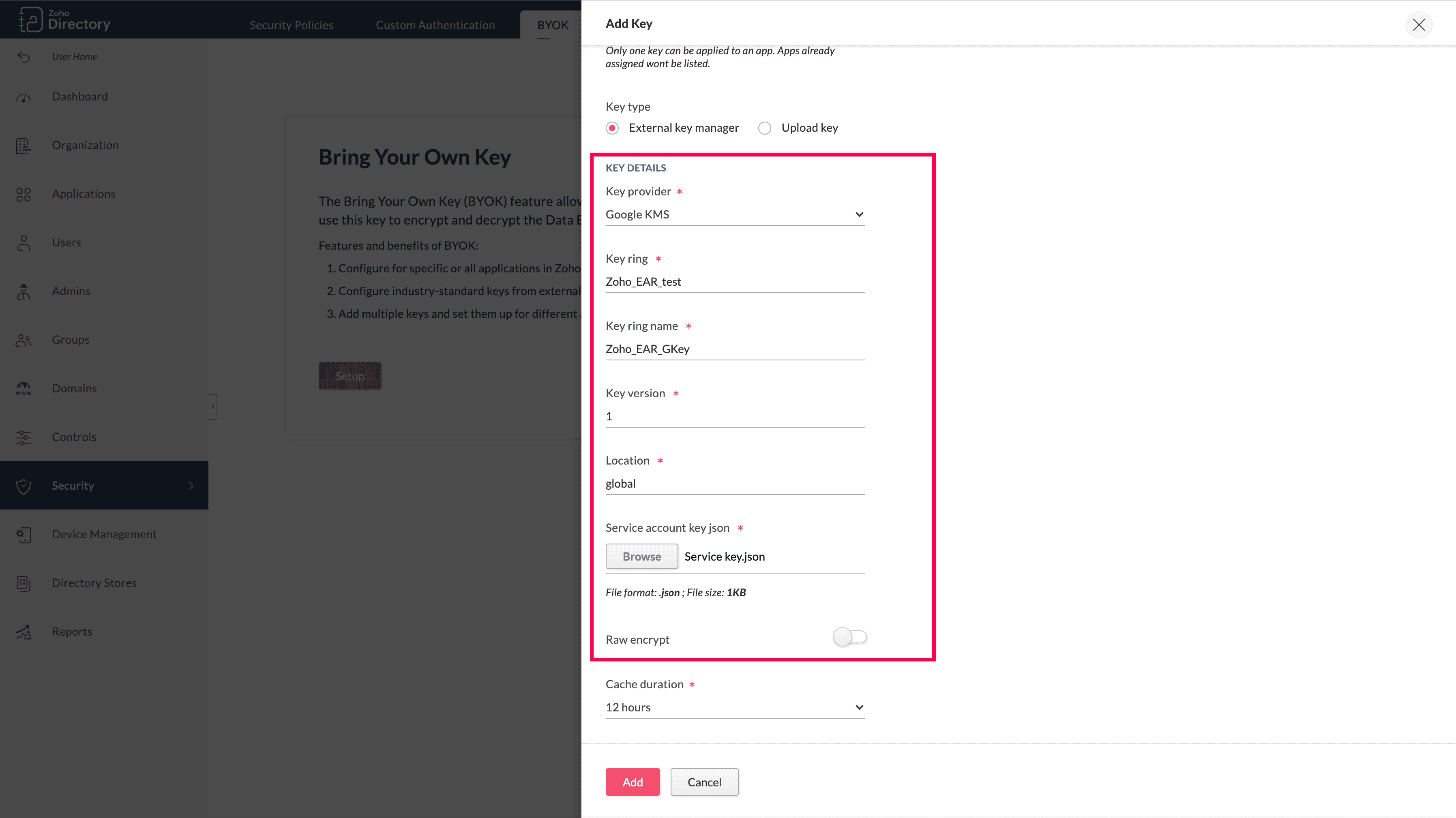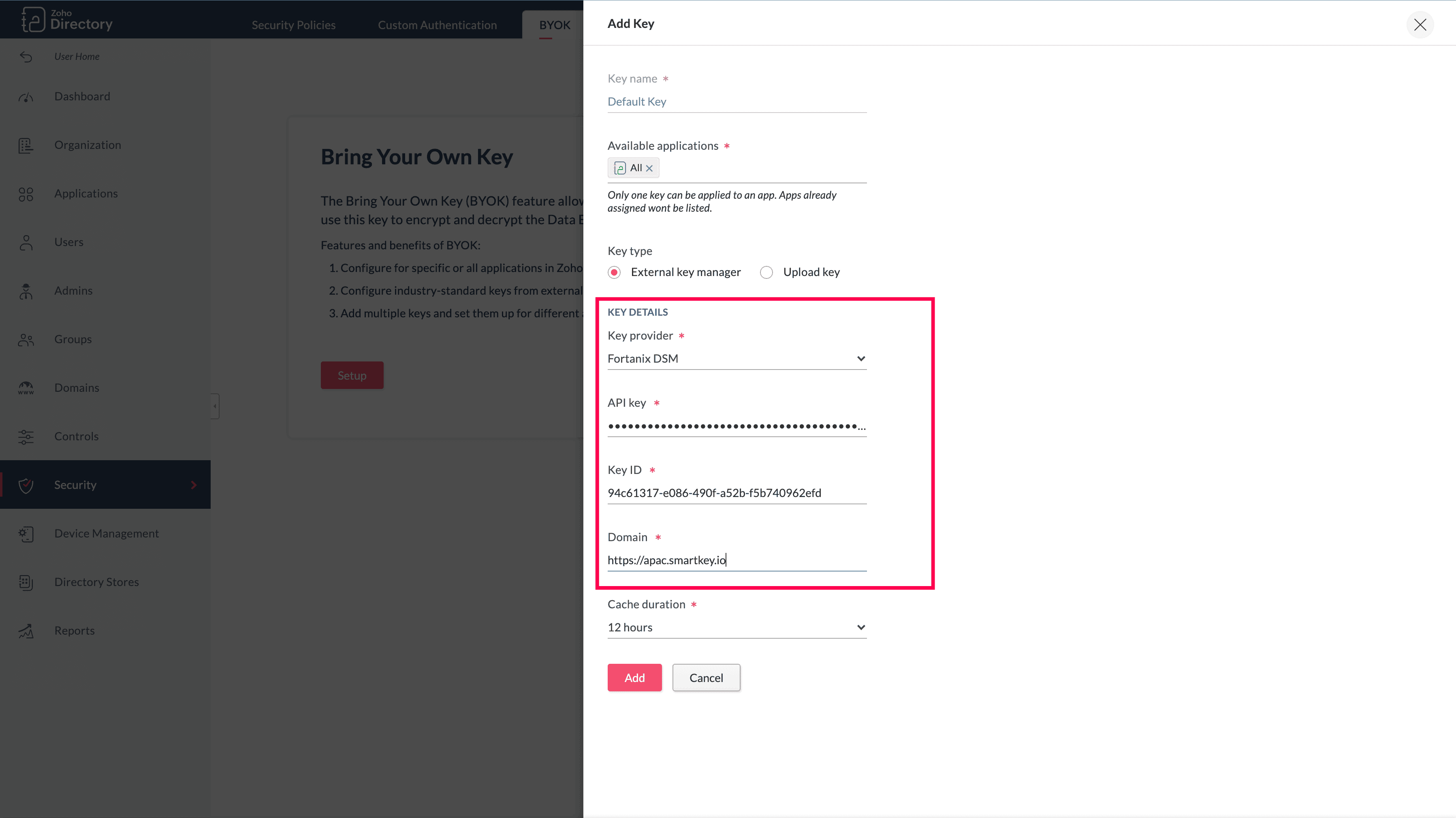 After you configure your key in Zoho Directory, we will send a request to your EKM to have our DEKs encrypted.