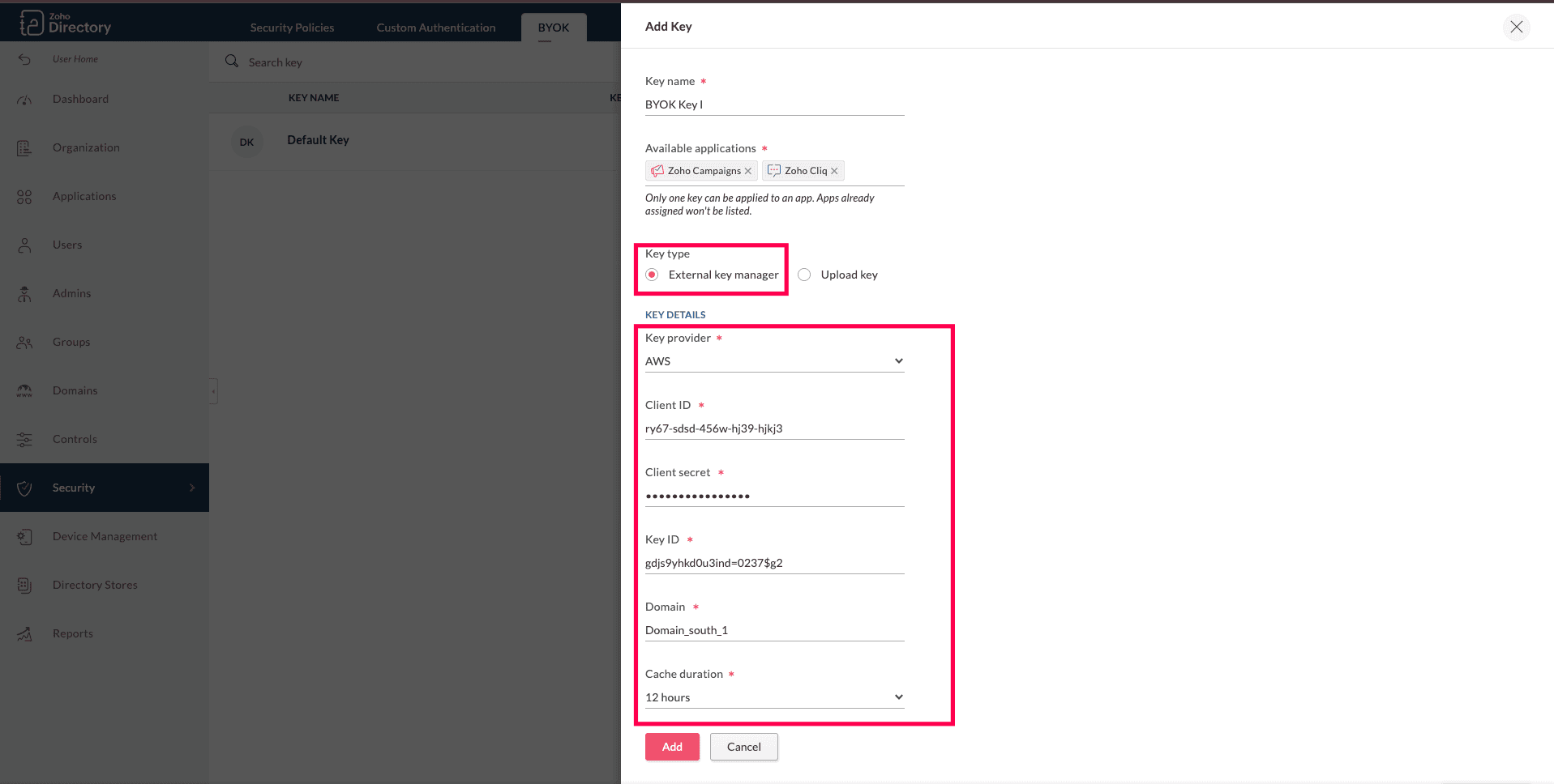 In the Add key screen, enter the Key name, select applications, and choose your key type as External key manager.