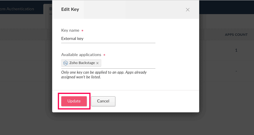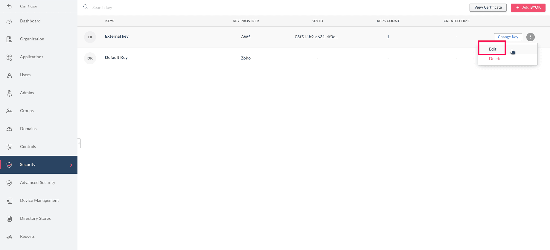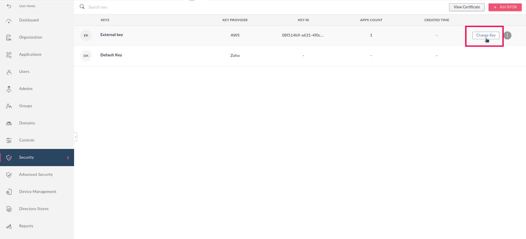 Click BYOK, hover over the key you want to change, and click Change Key.