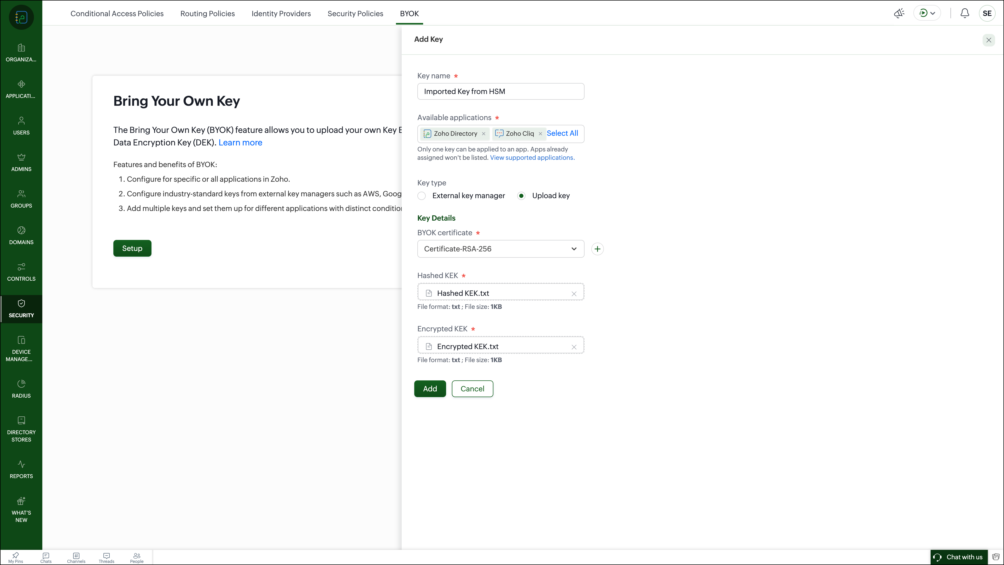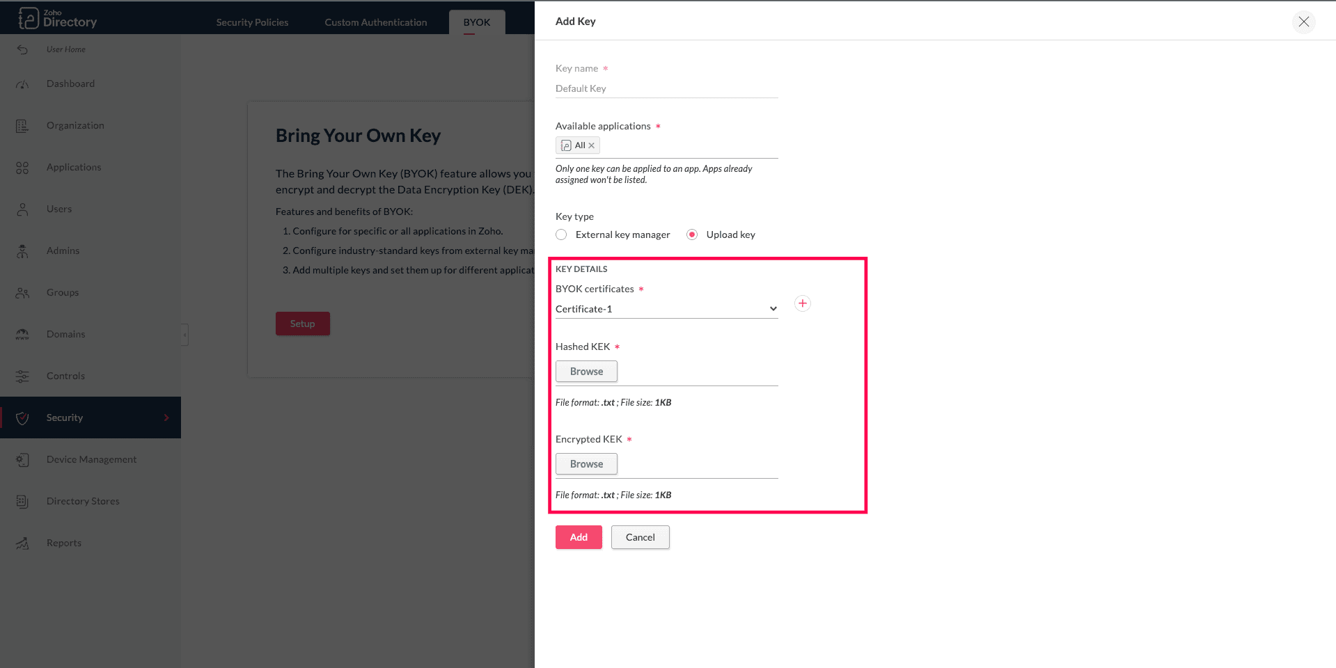 Upload the encrypted KEK and hashed KEK in Zoho Directory.