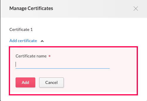 Click Add certificates, provide a unique name for your certificate, and click Add. Hover over the added certificate and click the download icon.