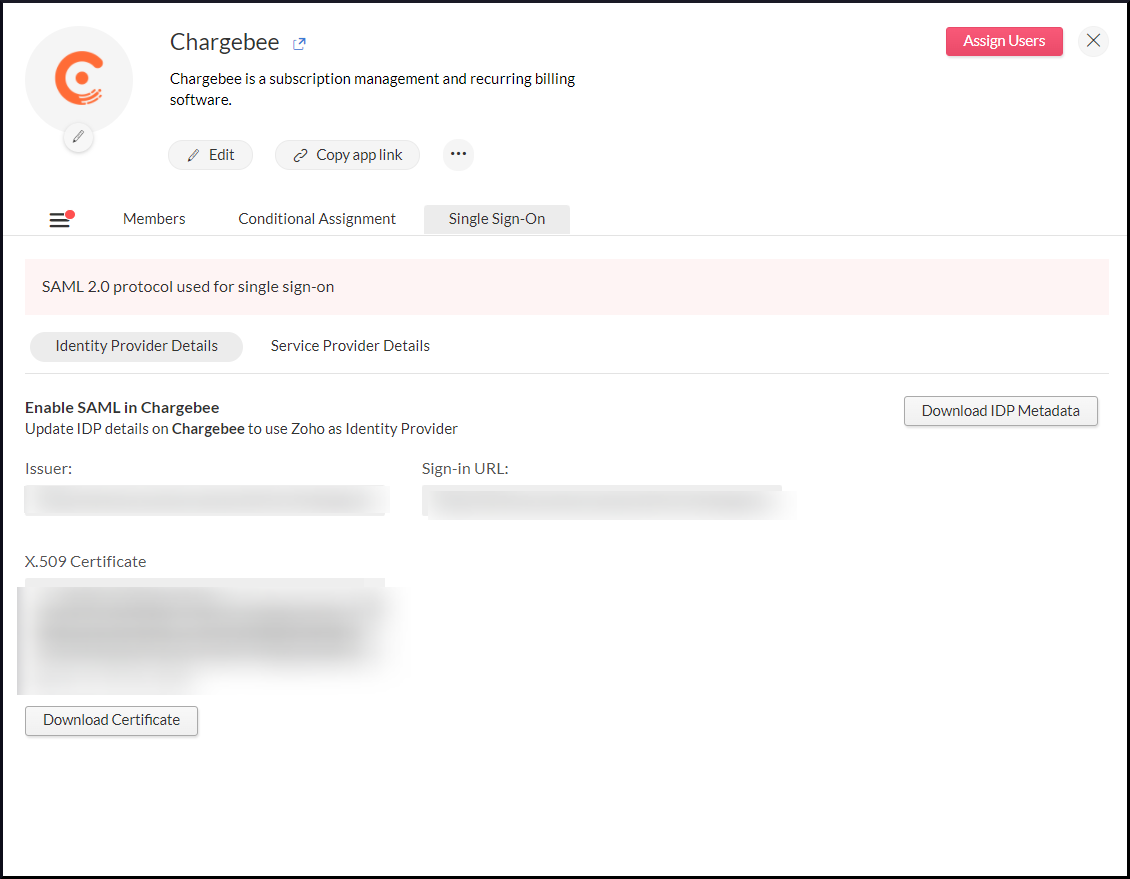 icon next to the app's name. If everything is working, you should be automatically signed in and taken to Chargebee's homepage.